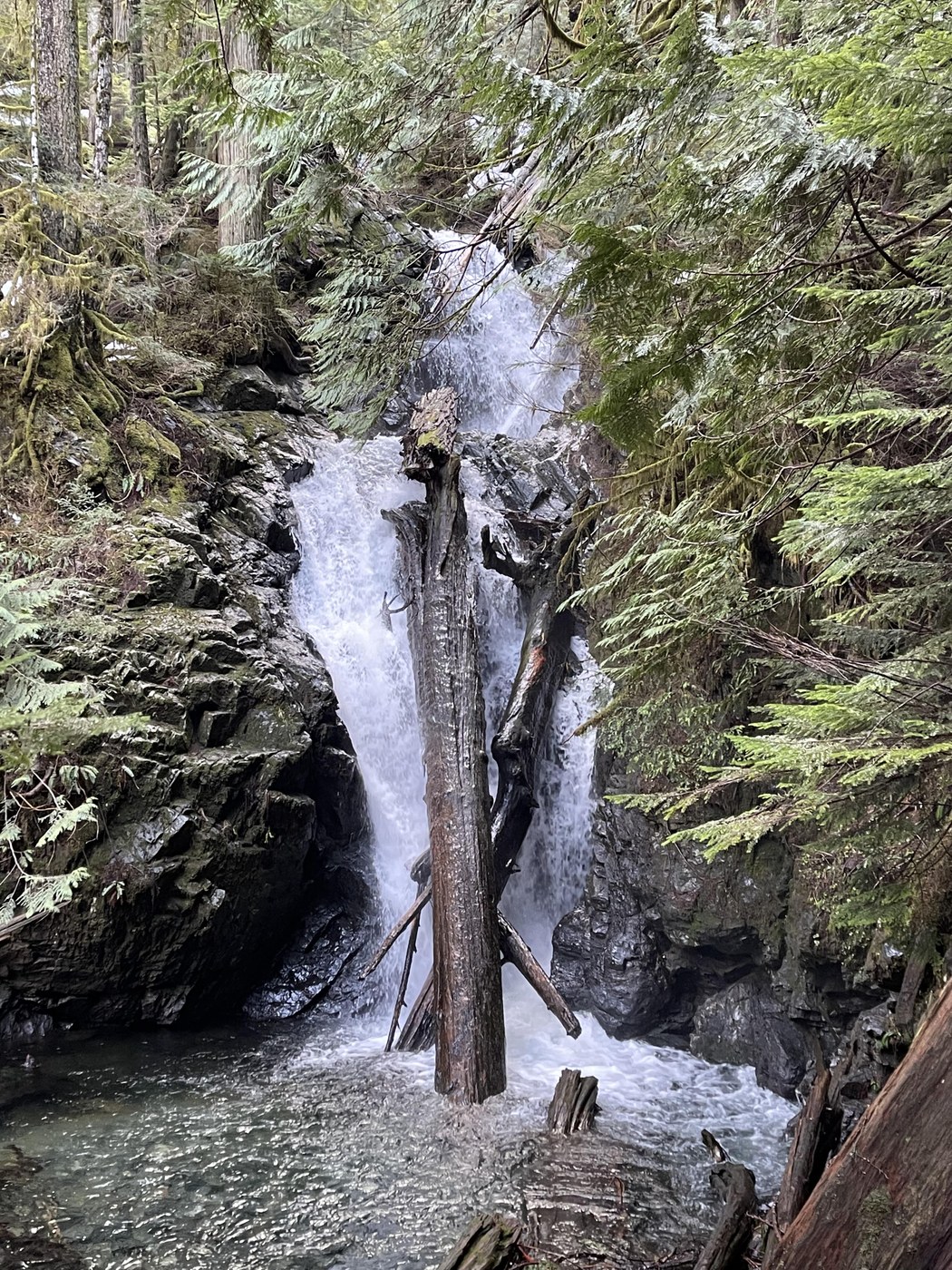 The first half of the hike is pretty uneventful, there’s some snow on the trail periodically but it’s easy to navigate. Lots of standing water on the trail so waterproof boots are highly recommended. Beautiful waterfall that was raging from snowmelt.
