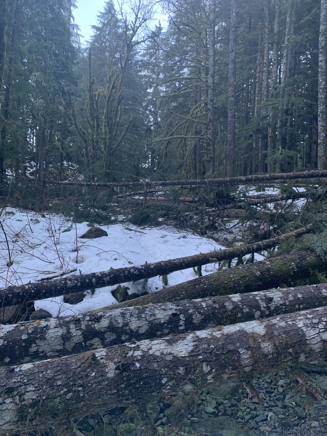Once on the Pratt Balcony Trail, there is snow intermittently, debris, overgrowth and blow downs that required route finding a number of times. And some of the trail had ankle deep water - so there was navigating to be done around that.