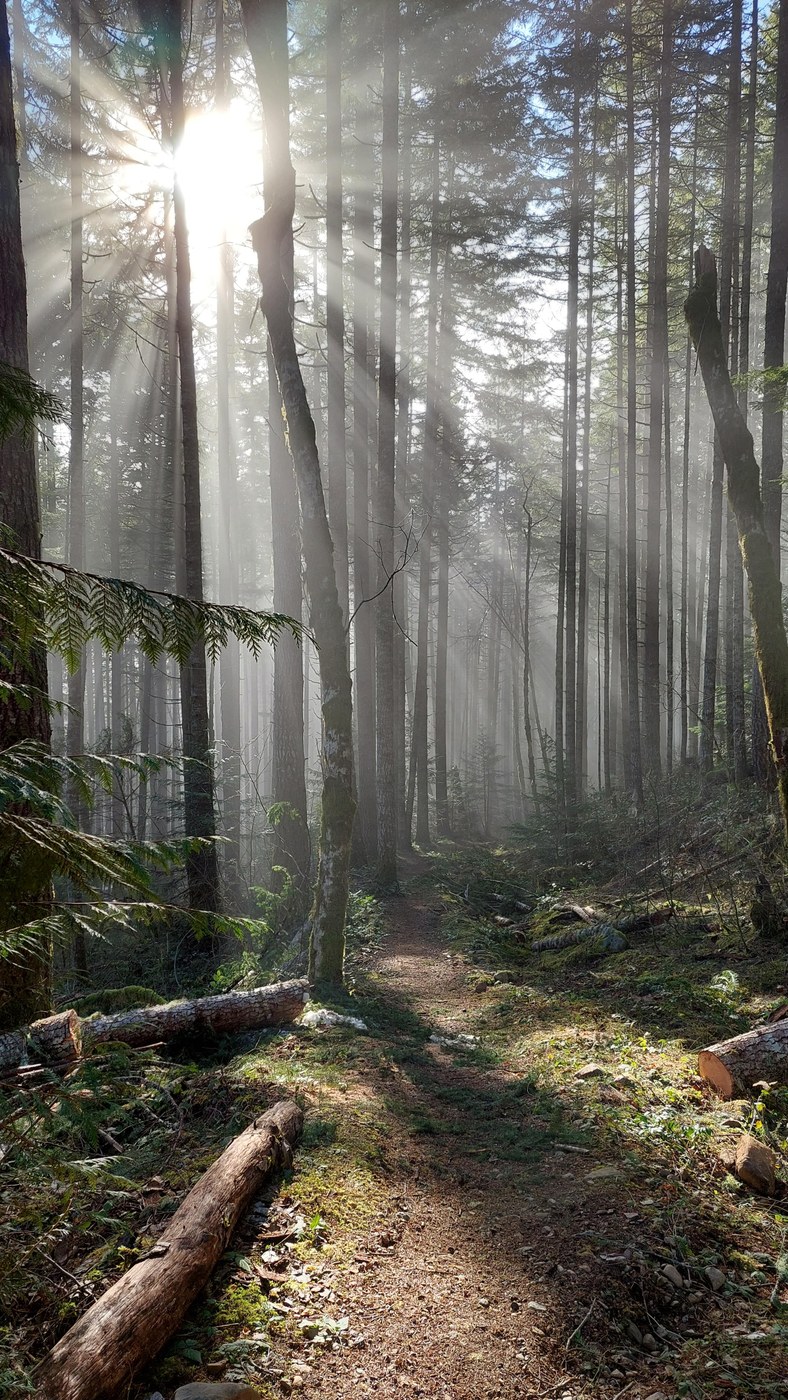 Many of the roads to the other river trails in the SE Olympics are closed with snow but the road to the Big Creek campground from Hoodsport is clear of snow. The campground still has lots of snow but the Big Creek loop trail has portions of trail that are snow-free. There were many blown down trees across the trail, however a trail crew was working on the trail today and cleared about 1.3 miles and plans to return on Thursday and next Monday to clear the whole trail. I hiked the first 2 miles clockwise with my dog until the blow downs became too hard to navigate through with a leash. We retraced our steps and logged 3.9 miles. I tried one of the restrooms and found it was open. We saw mossy trees, lovely forest duff trail, slidey snowy patches, sun shining through the trees in the mist, and the beautiful Big Creek. In addition to the work crew, I saw about four pairs of hikers - two with dogs. It felt surprisingly cold in the campground but was warmer (and more clear of snow) at higher elevation.