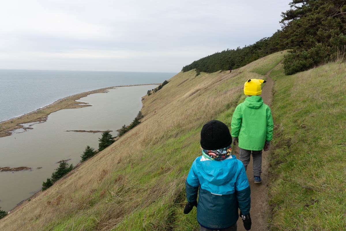 This is a really great walk, especially after all of the gray fog we just had. You have views of the surrounding mountain ranges and the Puget Sound for the whole walk. Even though there were a lot of visitors, the nature of the loop means that it didn't feel especially crowded. It does get narrow on the bluff portion of the trail but there are regularly beaten down spots to step off and let others by. If you have really small kids, there are spots where you might want to take care and hold hands because the hillside does drop off steeply in places. Overall a great hike for kids though.