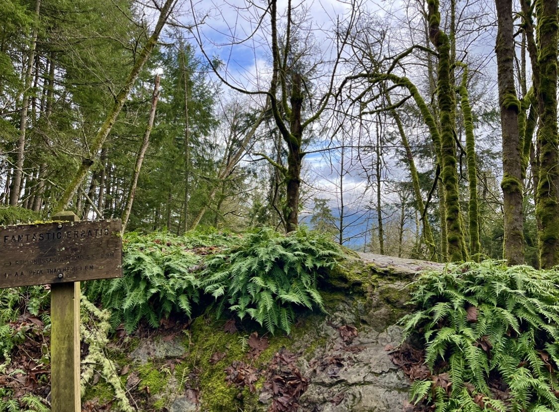 The main feature/attraction is "fantastic erratic," a large fern and moss covered glacial boulder - pretty cool! - and there's also a bit of a view here looking towards Tiger Mountain.