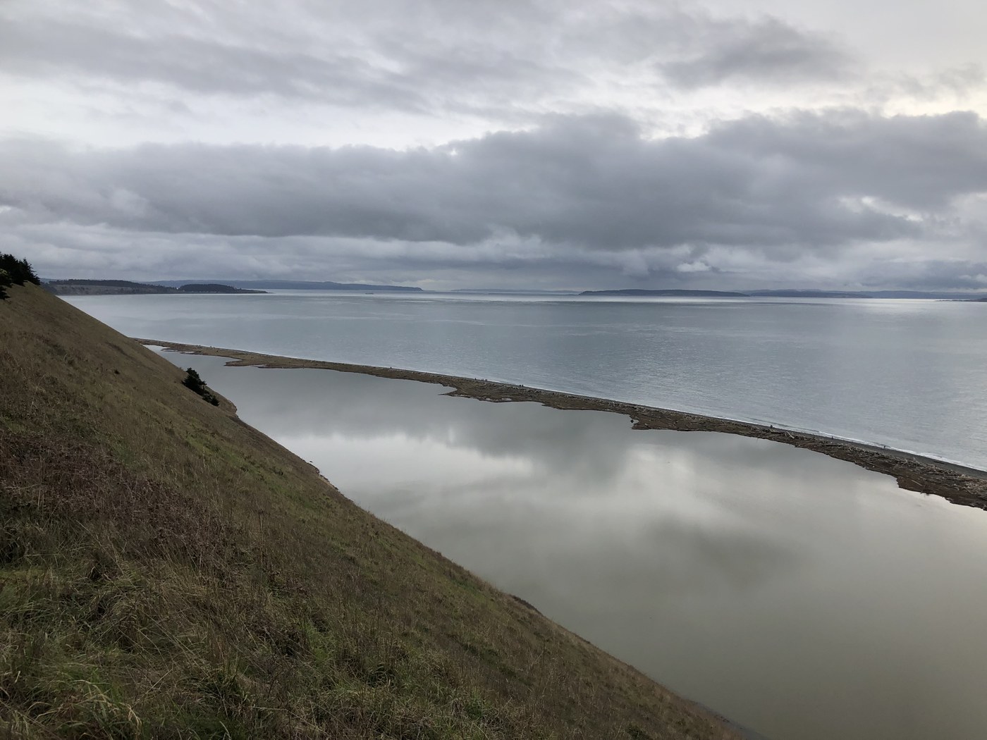 Around noon we left Coupeville and drove the short distance to the trailhead. The trail starts next to a cemetery surrounded by farmland that runs right up to the edge of the bluff. It doesn't take long before you reach the Ebey house and blockhouse, two of the interesting historical structures managed by our NPS on this site. The Bluff Trail is now within sight, and to the south there are great views of the farmland and sea. We took a right on the bluff trail to head north and immediately had to stop and take in the views. Puget Sound and the Strait of Juan de Fuca were calm and peaceful, and a large section of the Olympics were peeking above the clouds. This was the steepest part of the bluff and it was remarkable to see how far above the beach we were. As we meandered northward along the bluff the lagoon eventually appeared below us. Its water was so still it looked like glass, with a very clear reflection of the clouds overhead.