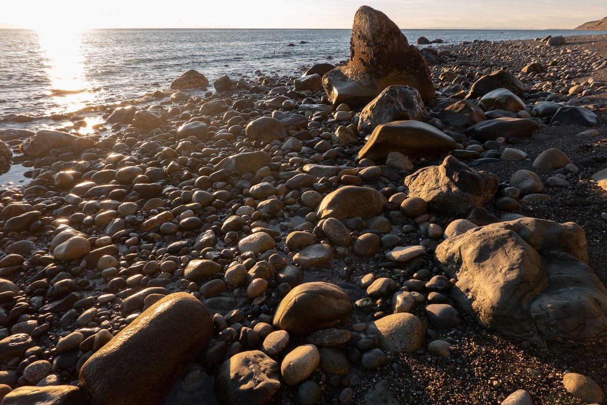 Conditions. The tide dropped from about 5 ft to 1 ft while we were there. Compact sand (with some pebbles) made walking easy. There was a ½ mile section signed as private property, but without any "no trespassing" signs. The steep bluffs above the beach looked not so stable, and there was evidence of slides in a few spots.