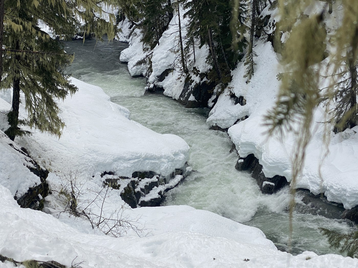 Decided to do a river snowshoe since avalanche danger was high. We drove to where 903 is not plowed and started our snowshoe there. We ended up using gaia to make it to Cooper River TH. It is about 2 miles from parking lot. We snowshed a bit along the river, but the snow was high on the banks and no boot pack to follow. Had lunch along the river and returned. On the way back we checked out the Salmon la Sac campground, which was very snowy. We needed snowshoes the whole time. The snow was soft and heavy at the same time, a work out with every step. When we were almost at the car, we saw a grooming machine tend to the pass. The hike should be much easier after the grooming.