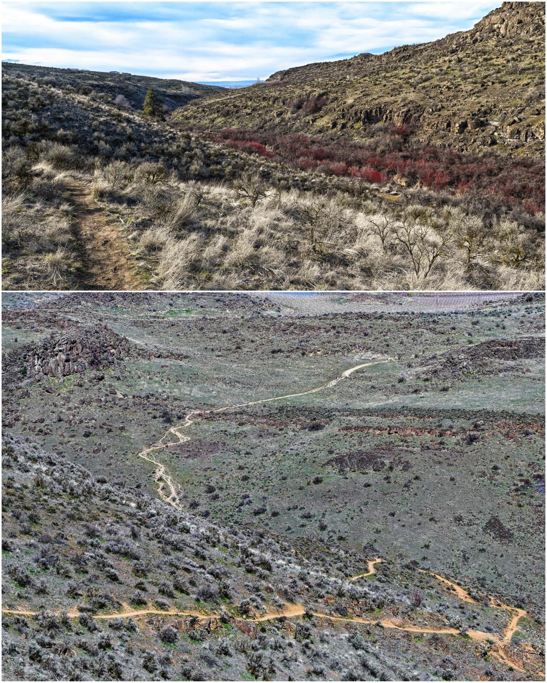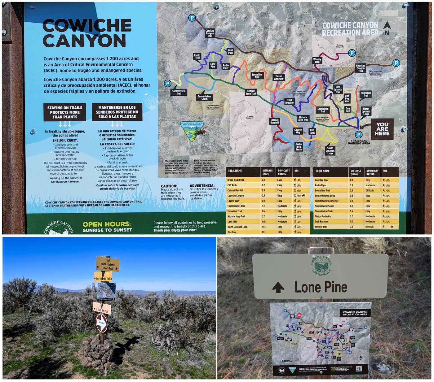 The upper Cowiche Canyon trailhead parking lot has space for maybe 20 cars or so. Good flow of people coming and going to keep parking spots opening up. We hiked counterclockwise: South Rim Trail to Radio Flyer (up and down through creek drainages), down Lone Pine into the Canyon, east on Cowiche Canyon Trail (interesting rock formations and a number of bridges over the creek), and then returned via East Uplands Trail to the upper trailhead (uphill portion to scale the ridge).