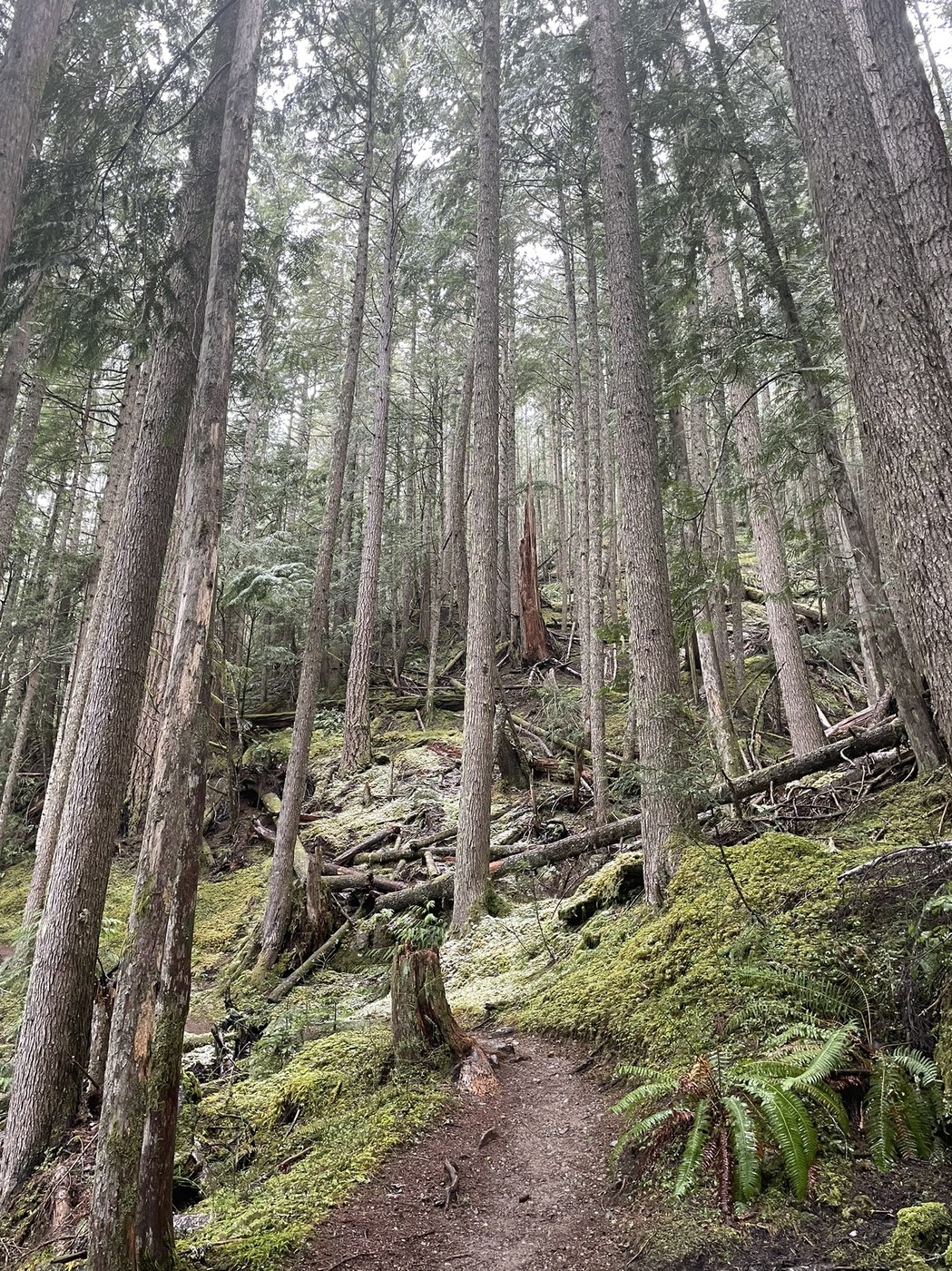 Some water over the trail in a few spots but nothing major. Light dusting of snow starts after the log bridge, about 3/4 mile from the lake there’s maybe 3-6” of packed snow/ice covering the trail, there’s a good boot path for now so the trail is easy to follow. Poles and spikes were helpful on the way down. Lovely, peaceful hike in the rain, snow and sun-got to experience all the above today:)