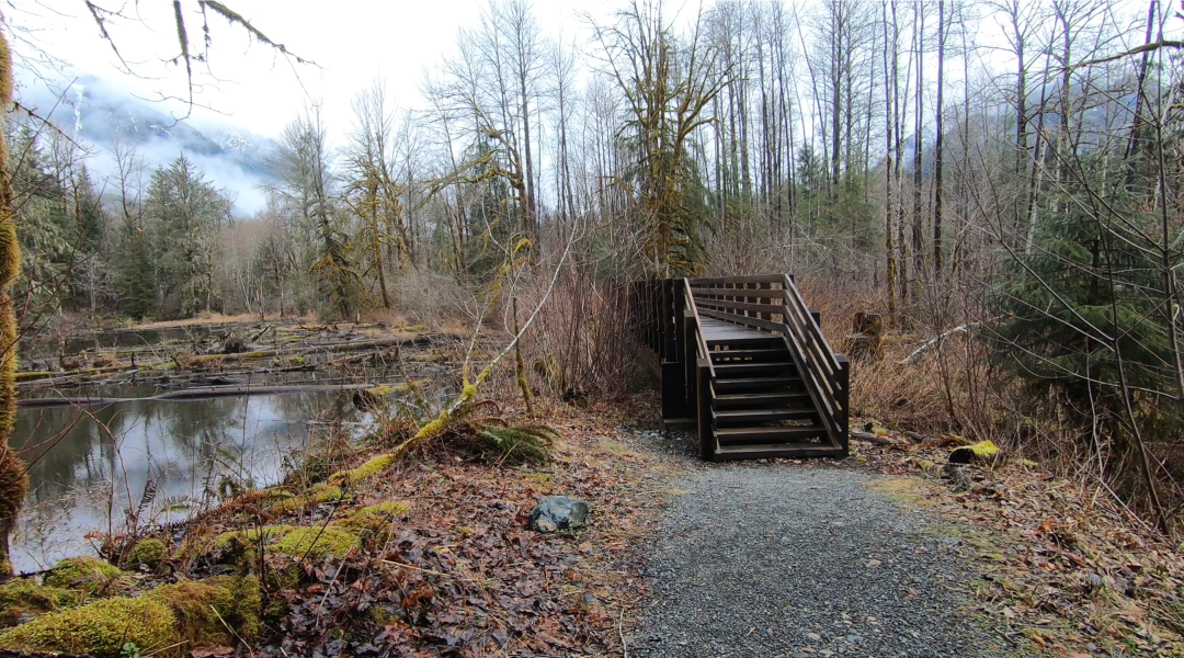 This is a great beginner, easy terrain hike. The entire trail is gently graded, neat gravel path, no mud large rocks or creek crossings. There are several viewpoints with benches along the way with views of the pond and surrounding mountains.