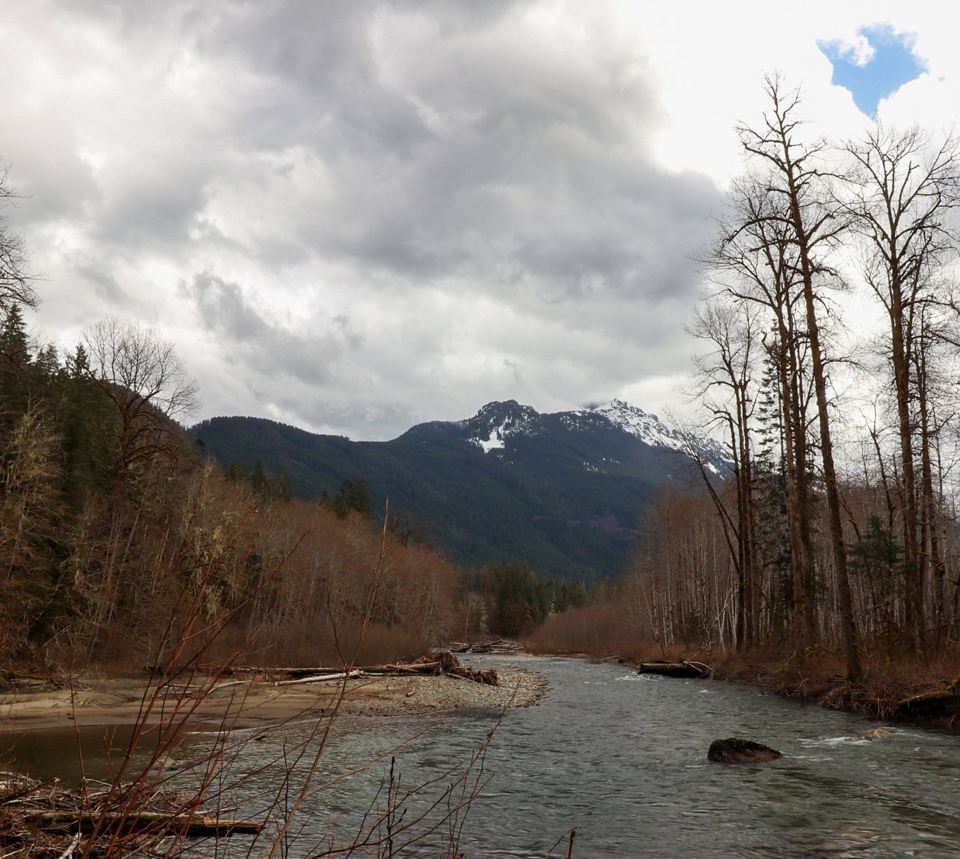 The trail continues and was easy to navigate to the end, offering a final river view and what I think was Mt. Forgotten in the distance. After the bridge, the trail is currently an easy walk with some downed trees. However, once the bushes get their foliage back, this may turn into a slight bushwack.