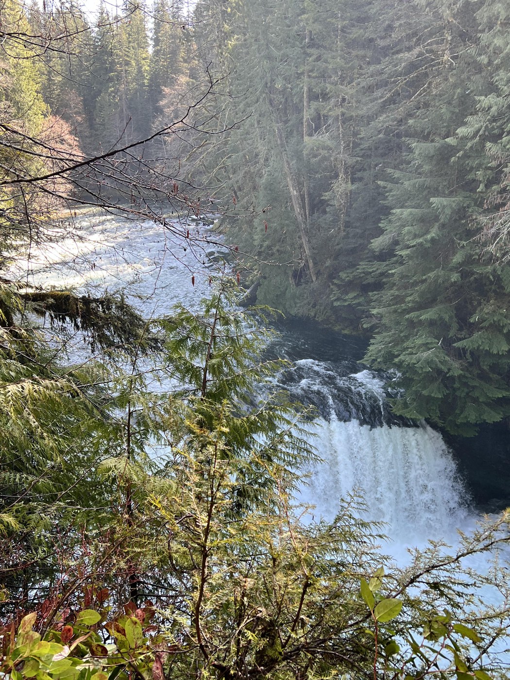 I started at lower falls and hiked up to Taitnapum Falls. A few down trees and patches of snow - all passable with two lab sized dogs. Down trees got a little thicker between Upper Falls and Taitnapum Falls. Had the trail mostly to myself.