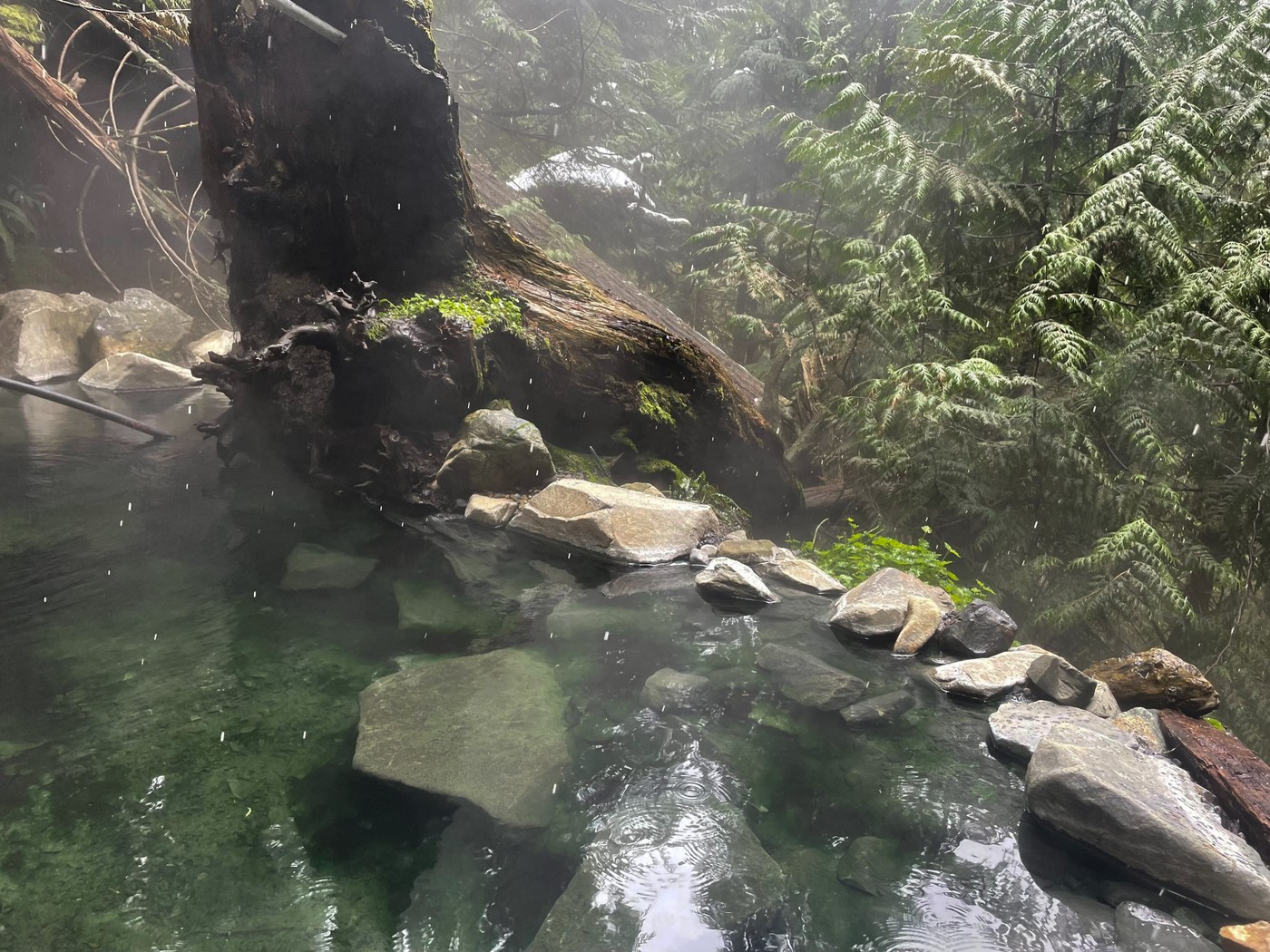 After that, the route is almost entirely on the road, which was in pretty great shape aside from a washout or two. Great views of the river from the old dam and along several pullouts. The road was snow free, but some patches of snow showed up in the last mile or so along the trail to the hot springs. A reminder that the Daniel J. Evans Wilderness boundary starts at the old Olympic Hot Springs trailhead (2.4 miles from the springs) and bikes or any other wheeled devices are not allowed past that point. On our way out, we saw some bikes chained up at the boundary, but also saw several groups biking in past it.