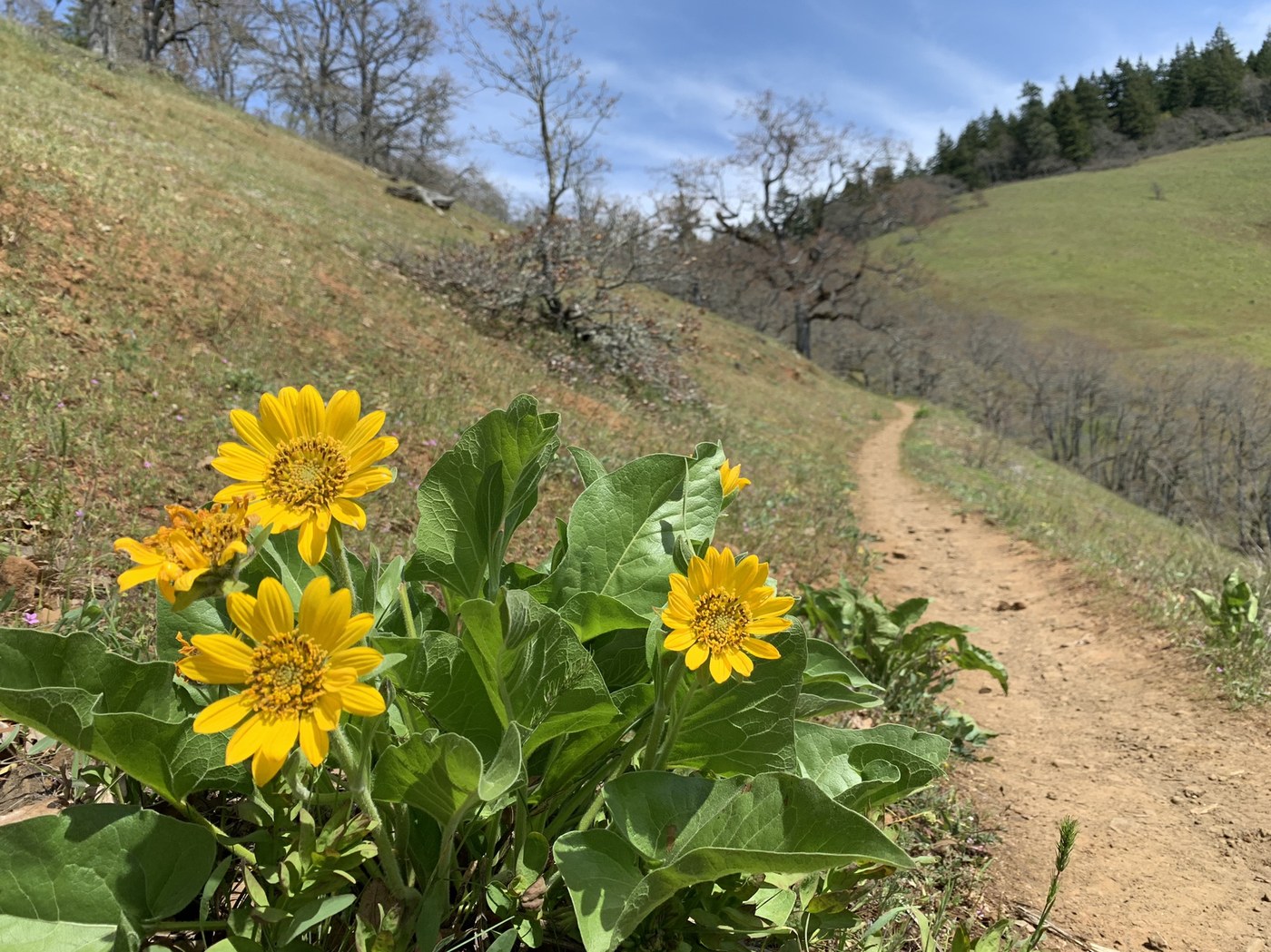 Trail in good condition with a couple wet and muddy spots to cross as well as one small log. Lots of green grass and wildflowers.