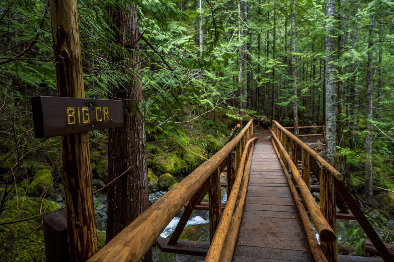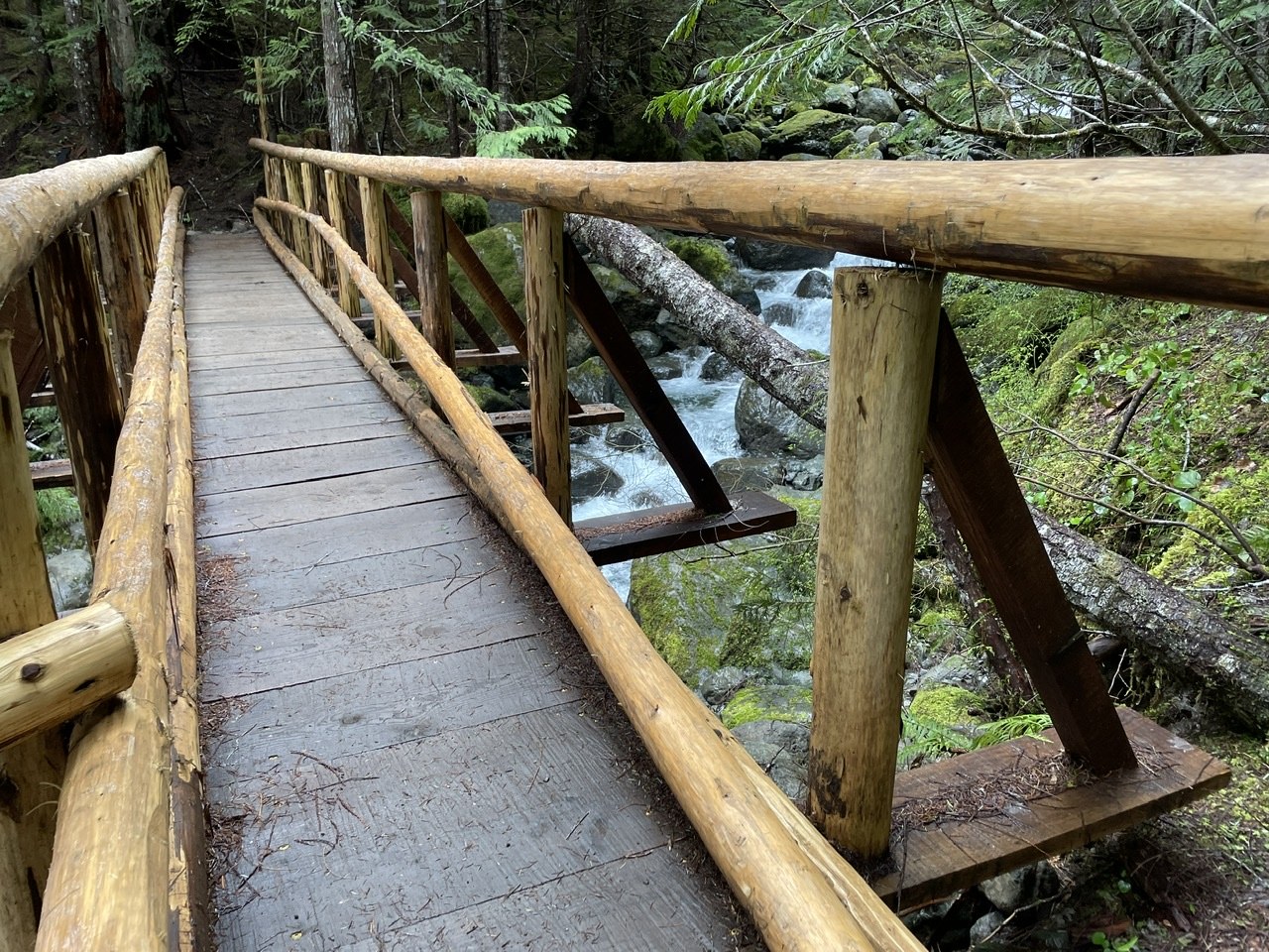 We parked outside the Big Creek Campground - the campground is closed for the season. There are a few spots to park right outside the gate and along the road. Past the campground gate, we found the Upper Big Creek loop trail not too far down the campground road on the left side. We took the trail clockwise as seem to be described in the trail description. The trail was in good shape the whole way and seems really well taken care of. There was one log down on the trail, but was no issue to step over. We noticed quite a few benches along the trail which is nice to have. There are lots of bridges to cross. We did notice on the newer looking bridge on Big Creek, one of the railing logs seems to be detached and coming off?