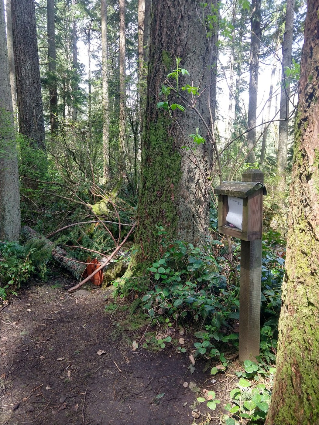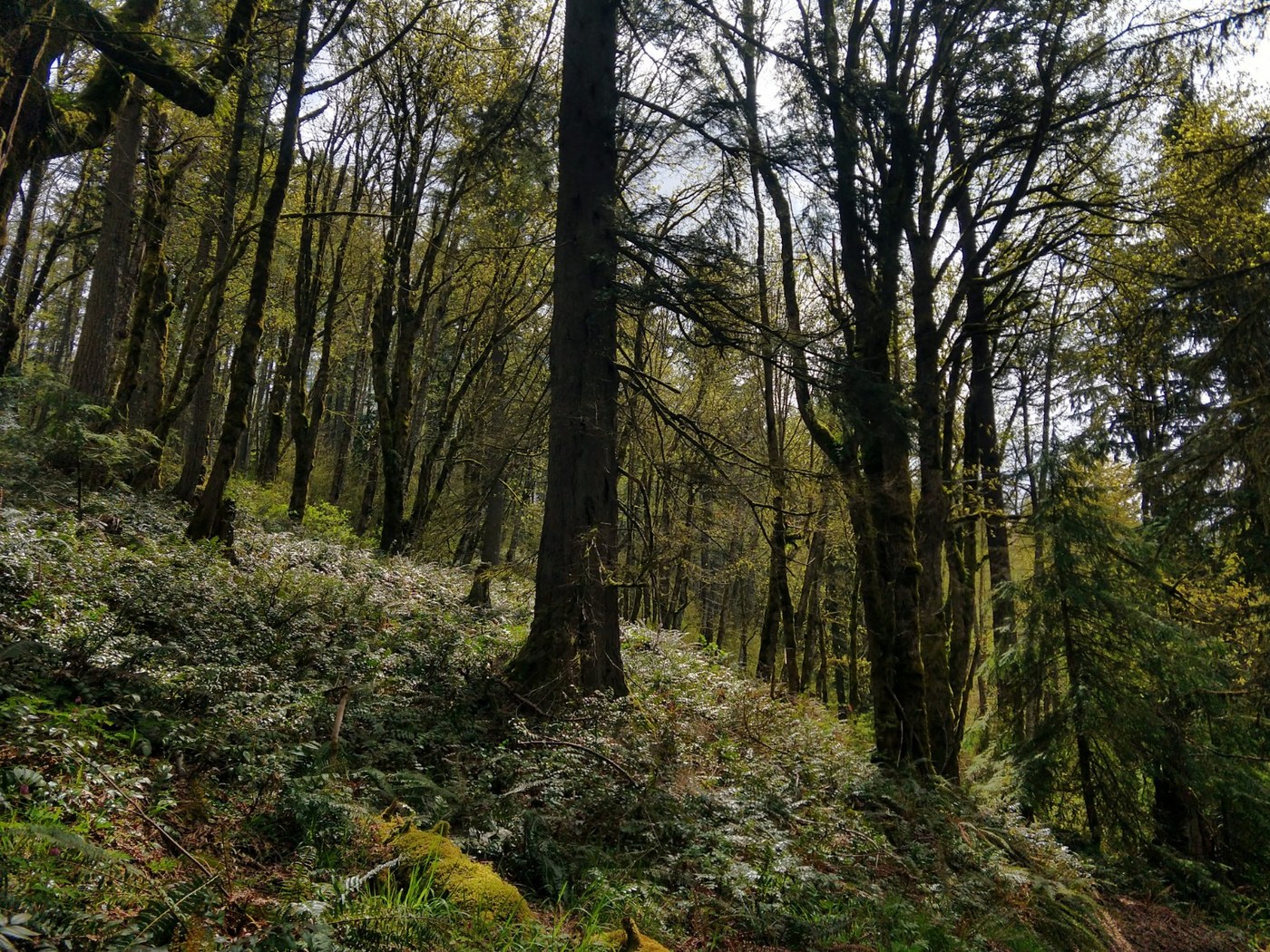 Hiked the loop counterclockwise on a lovely day. The trail's in pretty good shape, though there was lots of mud, sometimes on a steep slope, but we survived. Lots of trillium, miners lettuce and yellow violets, with some bleeding heart at the top. On the spur trail at the top, I was a bit confused because it didn't line up with what my map on Gaia was telling me, and what I remembered from my last hike here a few years ago. But that was made clear at the top, where there was a signed marked "New Jim Whitaker Trail" . Not sure who was supposed to read it, since it wasn't like there was any other way to get there--they did a great job blocking the old trail.