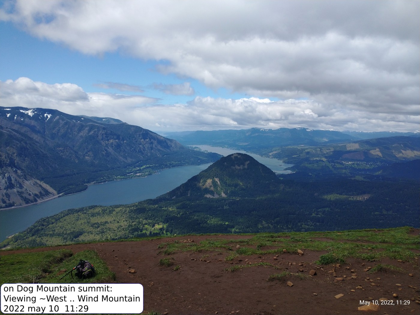 10may2022 TUE ~08:45, i was the ~10th to arrive at the Dog Mountain Trailhead parking. After reading the FS Trail-map at the Trailhead, i decided to do the "More Difficult" (instead of the "MOST Difficult") route .. i did a CCW-Loop: (T) > V > Puppy Dog viewpoint > Dog Mountain > Dog-Augspurger Tie > Augspurger Trail > (T)