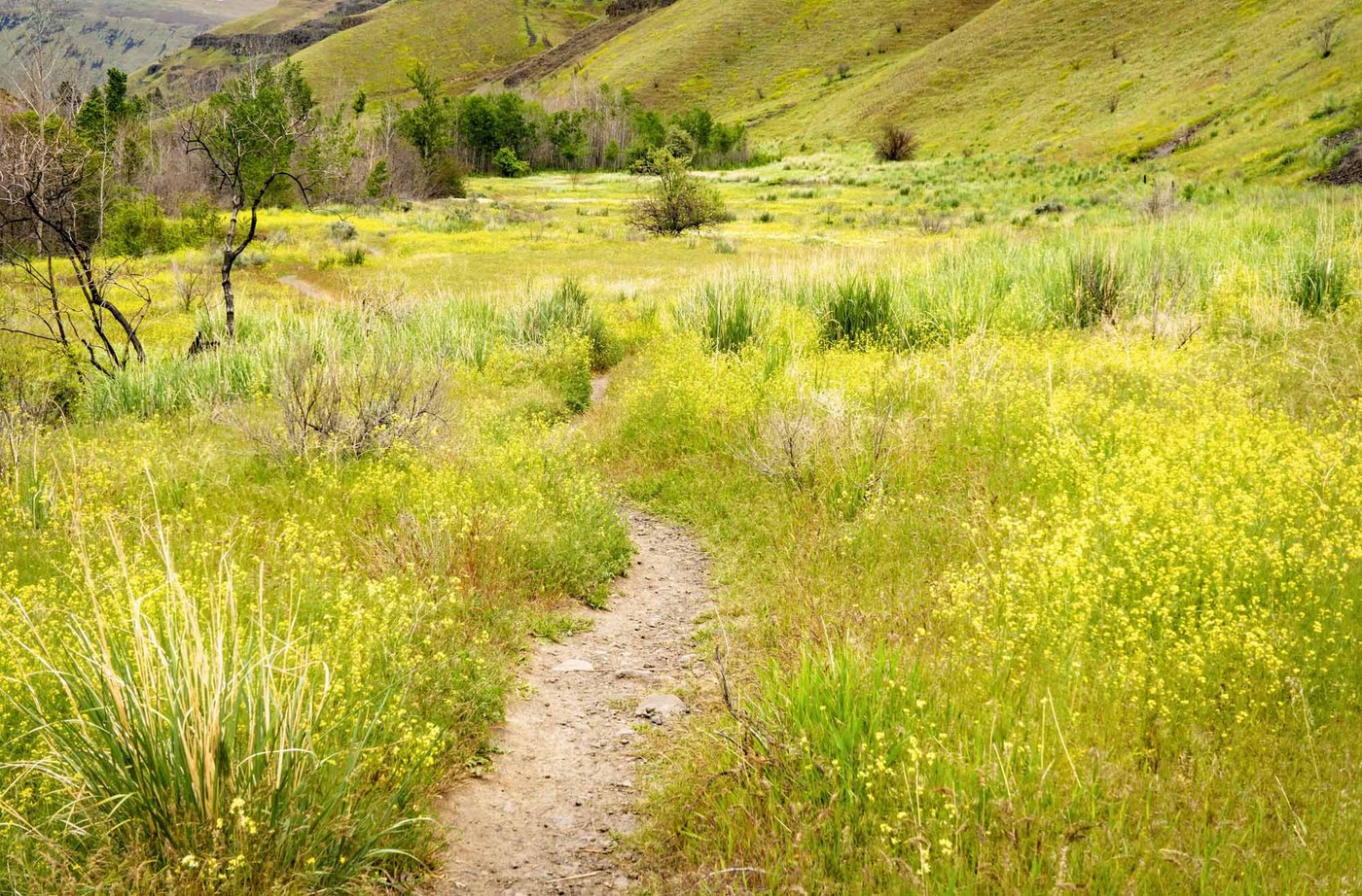 I had to meet Karen Martinis at Umtanum this afternoon to pick up some plants she had procured for me and we took a walk in the canyon afterwards. Karen turned around at the first crossing as she needed to get home, but I continued on to the big, spectacular buttress on the opposite side of the canyon from the trail. The afternoon was overcast and mild, perfect for walking, and the diffuse light brought out all the saturation in the green. There were a few other hikers in the canyon on this beautiful afternoon. There was lots of mustard and hoary cress and a scattering of other wildflowers. I didn't see any wildlife on the hike, but I did see a bald eagle, some deer, and some big horn sheep on the way home.