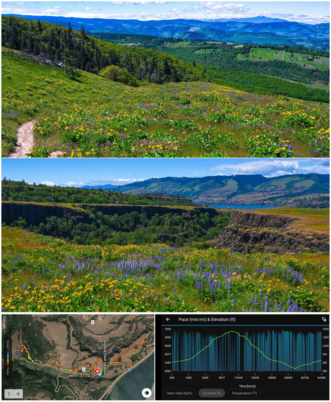 The two trails are the McCall Point trail, which heads up the flower-filled hillside, and then across the road, the Rowena Plateau trail. The latter was grassier and had fewer flowers (mostly dense spots of lupine), but you get close up views of the basalt cliffs and the Columbia River via a couple different available loops. McCall point on the other hand is an out-and-back, and this is where most of the vertical is. The two trails are sufficiently different to together make a great combination. Awesome day!