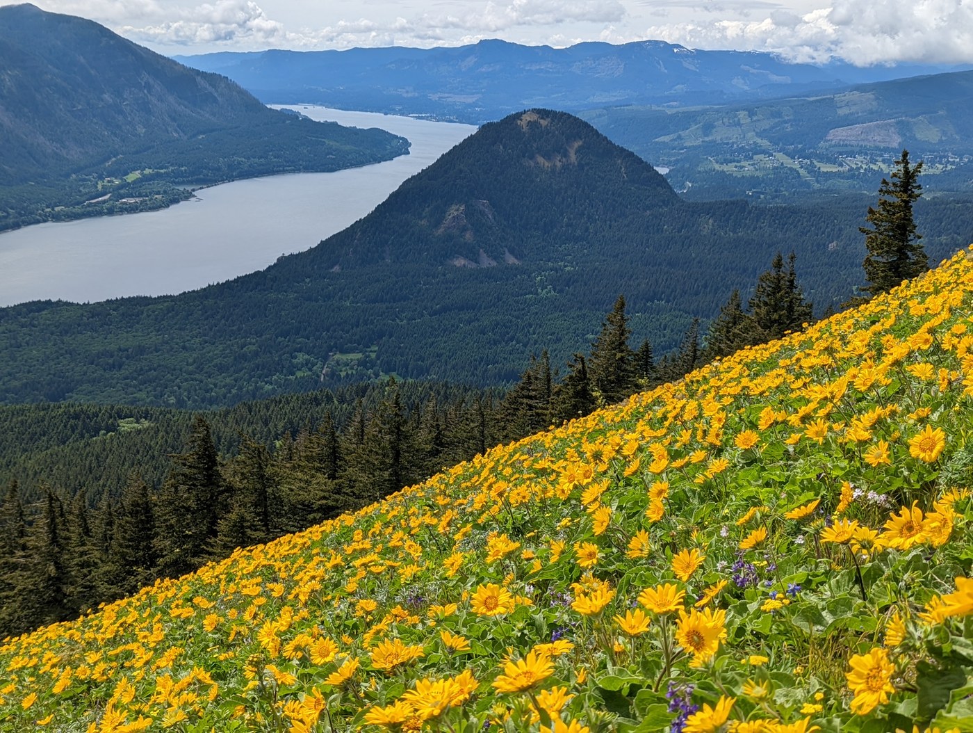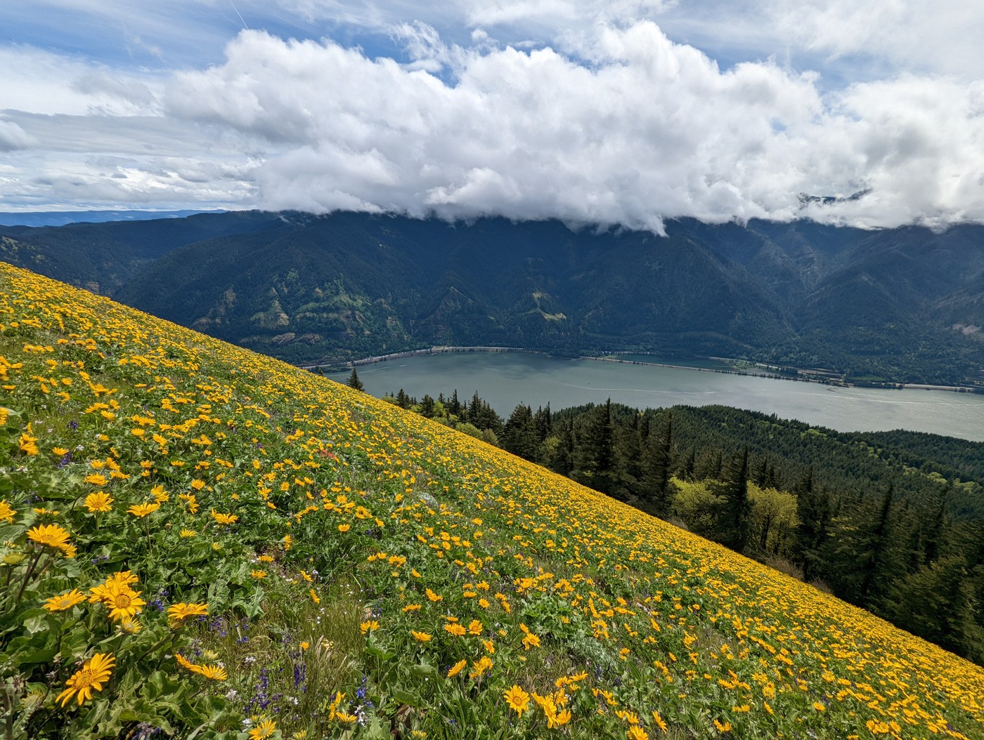 As we drove toward Dog Mountain from our hotel in Hood River, we drove into some low clouds covering the mountaintops above the gorge. Arrived at the parking lot a bit after 10am and it was mostly full. We hiked the main trail both up and down. As I hiked up much of the early morning rush was already hiking down. Wildflowers begin in the switchbacks that lead to the first junction. Once past the first junction I started hiking into the clouds and it got misty. Pretty low visibility and zero views at the first viewpoint, though the balsamroot were in peak bloom. Beyond the second junction when I arrived in the beginning of the open flower slopes, I was amazed to see the vast slopes of flowers on both sides of the trail. The best balsamroot fields I have ever seen, and at peak bloom! Unfortunate that the clouds were so thick and there were no views. I reached the summit 2 hours from the trailhead, including some photo stops. I did hike to the true summit in the woods, just to make it official. There was a good crowd at the summit viewpoint. I waited at the summit for over an hour, waiting for the clouds to hopefully lift and also waiting for my dad to catch up. At about 1:30, after I saw many hikers come and go from the top and when my dad arrived, the clouds began to lift and the sun broke through, lighting up the flower fields and opening up the great view downstream past Wind Mountain! The hike back down through the flowers was absolutely spectacular!