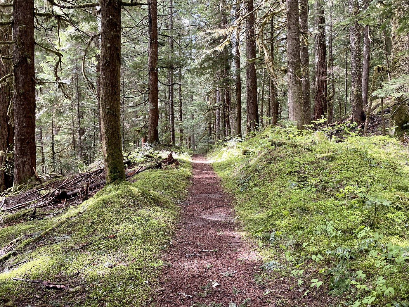 I started at 6:50am, it was 50 degrees and misty/drizzle. Most of the hike I was in short sleeves and a hat. Warmer layers were nice when I stopped for breaks. You could easily trail run this as well, but I liked having sturdy boots and poles. It rained some along the way, but I stayed relatively dry in the trees. Some sunshine on the way back, which was a nice bonus.