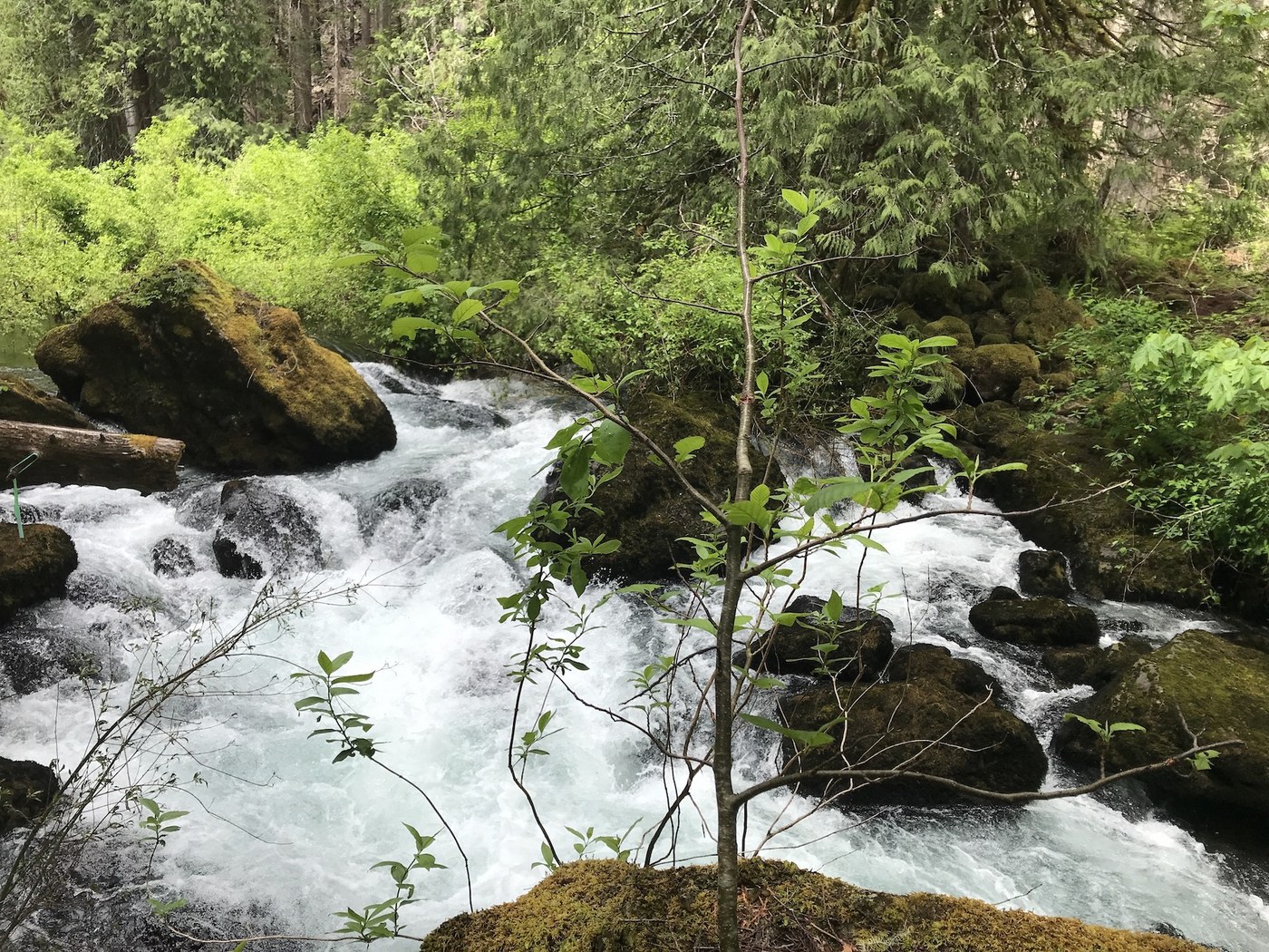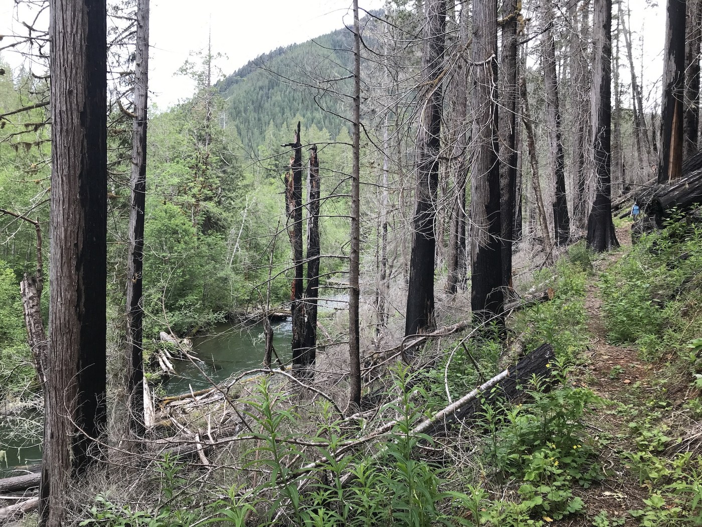 We drove to the trailhead off of 2401 across the road from the short trail to the upper lake (that trail is only 0.2 mi. but very brushy - lake is pretty though), and had no problems on the road. (Hamma Hamma to 2480 to 2401) We intended to hike a loop - trail 805.1 skirting the lower lake to the east, crossing Jefferson Creek, hanging a left on Elk Lake Tr. 805 to Rd. 2401 and walking the road back to our car, but there is no way to cross roaring, rushing Jefferson Creek (sign on board said bridge was out) even though there were green ribbons on either side showing where the respective trail is. I suppose maybe at the very end of the summer it could be a low flow? So we backtracked to our car, drove to the end of 805 and walked that up to the same river crossing spot on the other side. That side of the lake is where the fire was a few years ago (2018) and the burned trees made an interesting and different landscape. There was fireweed growing all around, so we'll have to go back later in the summer to see them all in bloom. There were several other wildflowers in bloom on both sides. 4.26 miles - pleasant walk - saw no one on the trail