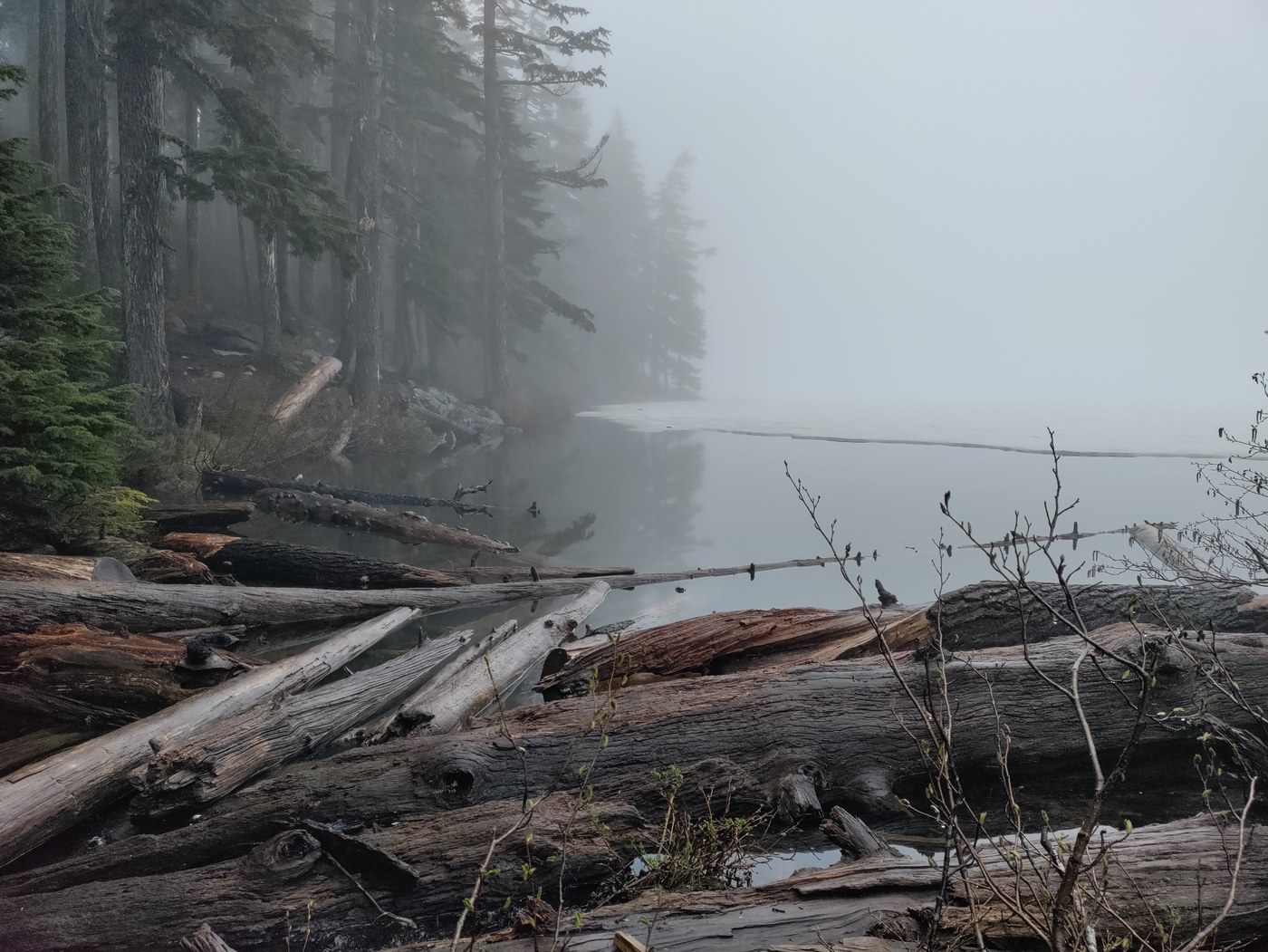 The lake itself is thawed around the edges but still frozen in the middle. It was foggy and serene, really a sight to behold. I was grateful for the rudimentary toilet hidden in the trees. I found a great large rock to eat my lunch on, and became rather chilly as I cooled down - pack an extra layer! Taking my sweet time, I made it from the trailhead to the lake in just shy of three hours.