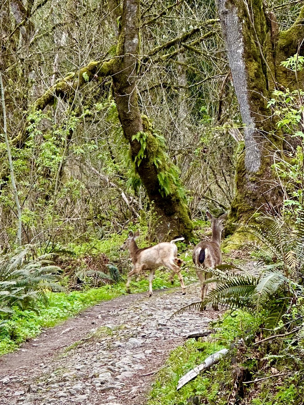 If you're expecting a view on this hike/at the top, you'll be disappointed. The best view is at the trailhead, at the viewpoint. However, this trail is a great practice in the life lesson, "it's all about the journey, not the destination." Trilliums, salmon berries, bleeding hearts and more are all blooming. Devil's Club is just starting to leaf out and there is lots of it on this trail. The birds were out singing at the top of their lungs, and I even came across three deer--we said hey before they dashed off the trail. I also loved reading all the historical boards along the trail about mining and logging in the area.