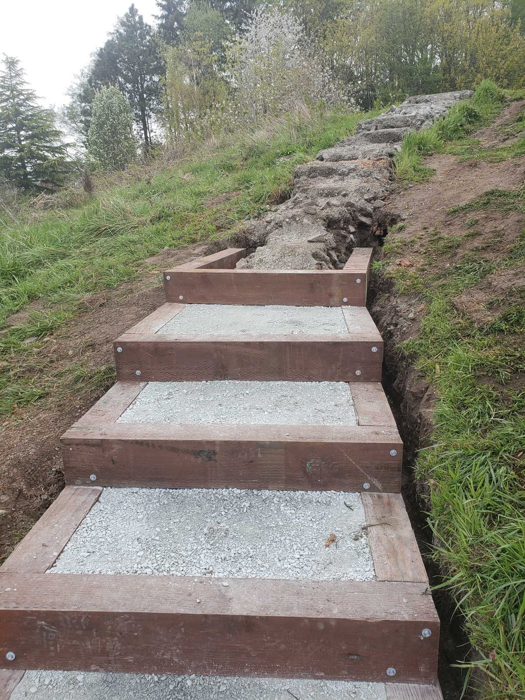Our crew installed a couple stairs and prepped the rest of the box steps for the Saturday crew. We had a nice visit from some other office staff during lunch, and enjoyed the sun and a breeze. Afterwards, we headed down to the beach to see the troll, part of Thomas Danbo's Way of the Bird King series. There's a great little loop with some good elevation gain that starts right by Solstice Park and comes out at the center of the park. The trails aren't particularly well marked, but using Gaia helps you stay on track.