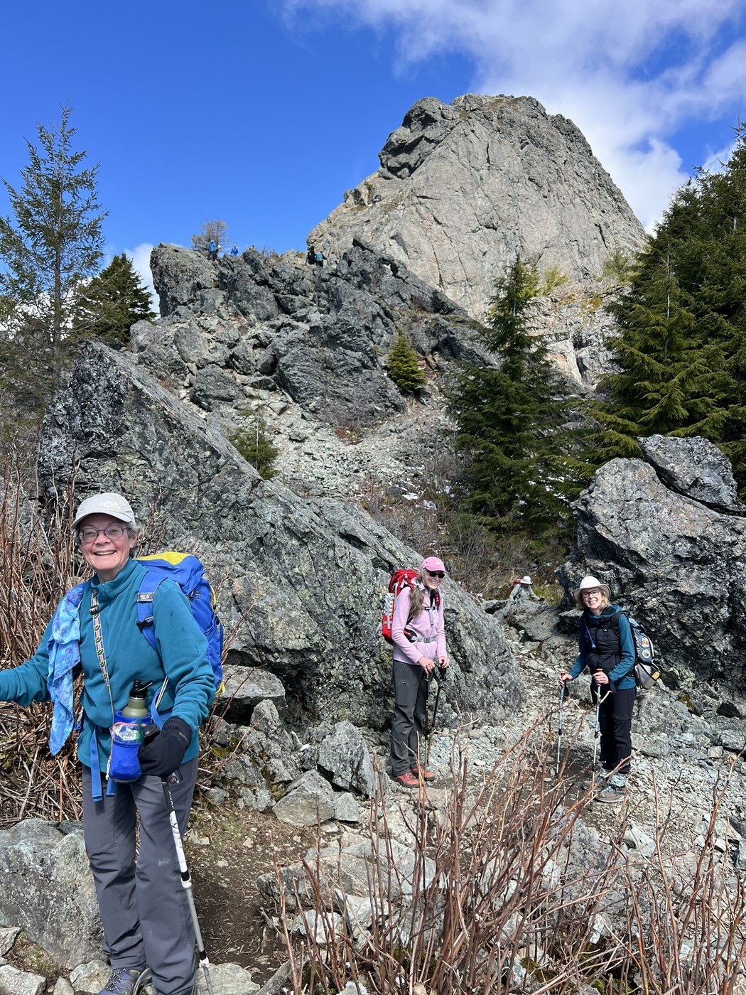 Puffy cumulus clouds made great photo ops with blue skies and territorial views from the top! I met up with my hiking group here. They mentioned several icy areas as well coming up the Si trail. More wildflowers are emerging in the first couple miles of the trail. Yellow Violets, bleeding heart, stinky Bob, miners lettuce, salmon berry and avens were all blooming. Wildlife sightings include camp robbers and squirrels looking for food handouts and 2 chipmunks down in the forest. The ice and snow was really starting to melt out on the descent. Trail traffic on Mt Si trail was what you’d expect- busy. I was surprised how many hikers were heading up the trail between 3:00 & 4:00. It warmed up to 50 degrees when we arrived at Mt Si Th lot at 4:15. Another fantastic day out in nature with friends.
