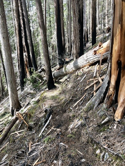 Previously several reports have indicated inability to find and follow the trail where trees got burned, fell, and large areas were burned completely through the ground cover and roots. A key in helping to find the trail was gaining the existence of newer gps tracks from Darrington Forest Service and from Green Trails Maps. The older Forrest Service maps showed the track in a very different location. The detective work to find the trail included finding old cut log ends, existing but covered trail structures and a bridge, and seeing that there are lots of tree blazes that have grown over to be very subtle alignment indicators. The trail is now discernible and the recent work of cut logs, tread repair, and brushing goes 1.3 miles through the area that was burned; up to about 3100 feet elevation. This trail was minimally maintained before the 2020 fire, and remains a somewhat more difficult and steep trail.