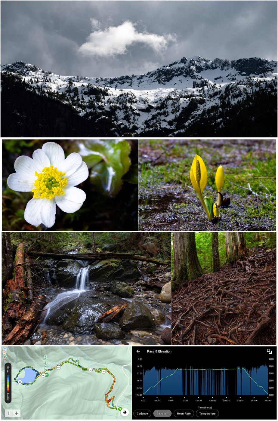 - Trail: The trail on paper is very similar in effort to Rattlesnake Ledge - ~4 miles RT (without circumnavigating the lake) and ~1200 ft vertical. The difference is that the trail is quite rough and eroded in sections, with water damage to bridges, stairs and the trail bed itself. This was my first time on the trail, so cannot say this is new. At least 1/2 of the ascent is on an old logging road that becomes somewhat more disguised with the ascent. The forest character changes with elevation - the bottom with stump remnants of some massive old trees, the middle with dense 2nd growth that is dull and blocks out any understory, and the top transitioning from some massive old growth trees (e.g. amazingly huge cedar with a split top ~1 mile in) to smaller subalpine trees near the lake. There is a lot of flowing water on and over the trail right now, so waterproof boots are recommended. There are a few waterfalls, but nothing like neighboring Lake 22 with its many beautiful falls on the ascent. The boardwalk around the lake is mostly buried in ~1-2 feet of snow, but there are clear sections (see pics) CAUTION: areas of postholing, but nothing too bad (colder day). Quiet - only saw a handful of other hikers
