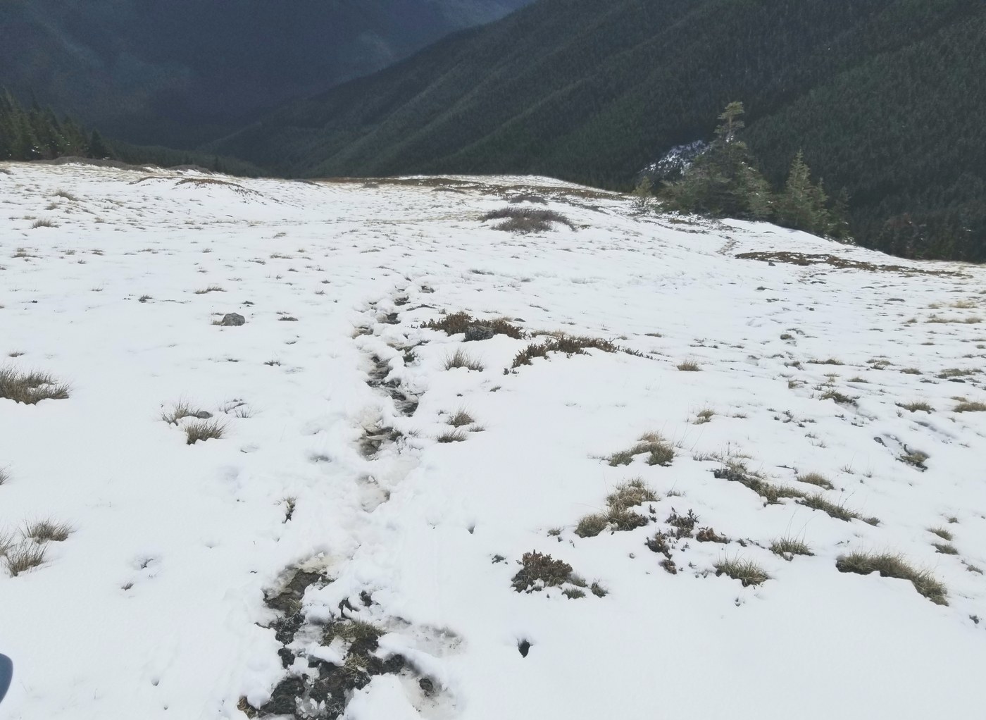 This week's snow brought a couple inches to this area. The final slope above the tree line headed to the saddle was a steep field of slushy mud. Passable but not very pleasant. I recommend waiting until things dry out a bit! Otherwise, I highly recommend this under-utilized trail with spectacular views!