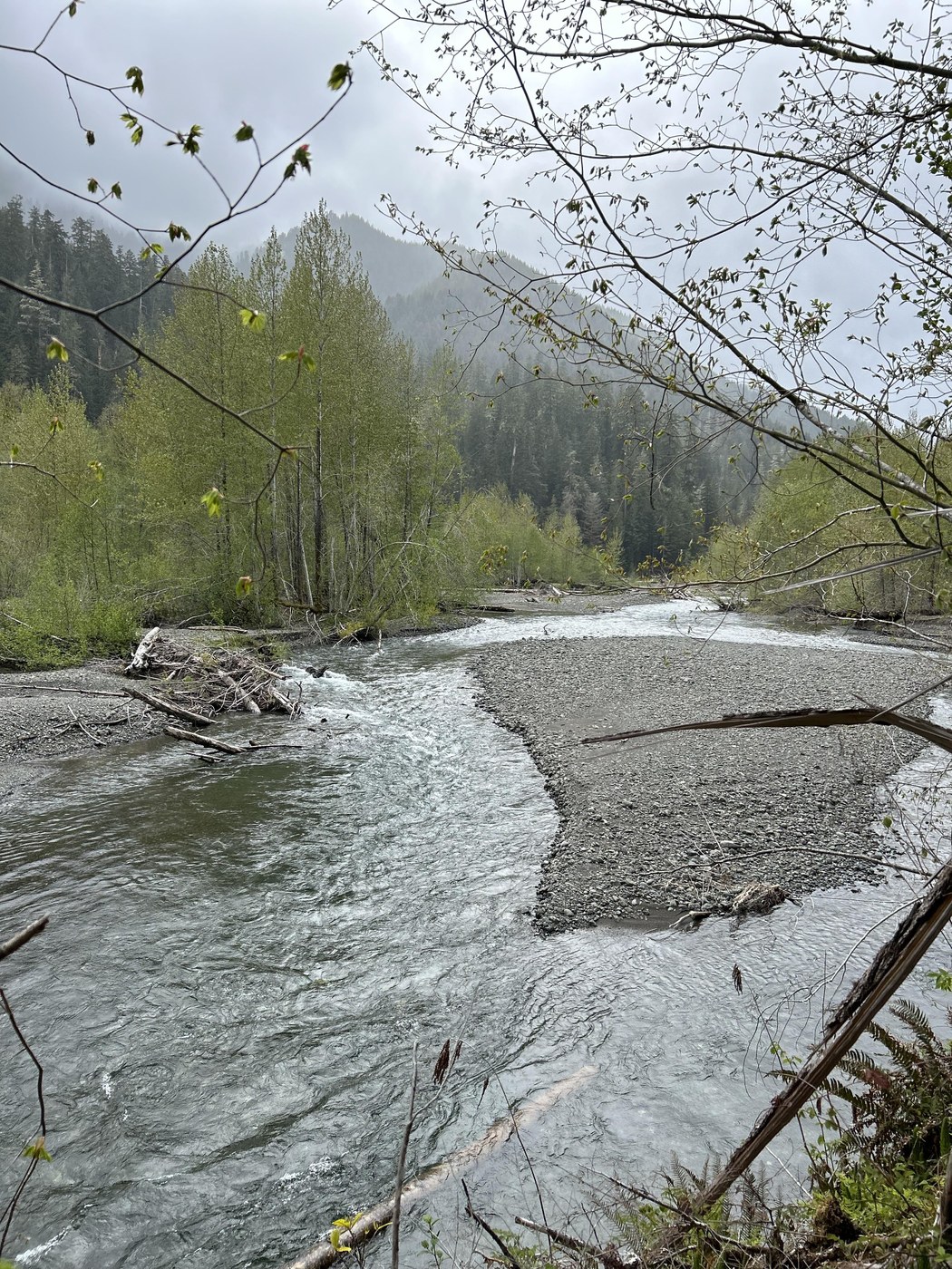 The trail is on great shape. Peak-a-boo views of the river below through much of the trail. Soft pine for great footing. And beautiful mix of very large, very tall old growth trees. And, there has been a lot of recent work (assuming from various volunteer groups?) including bushwhacking, fallen tree clearing and repairs. Trillium in bloom.