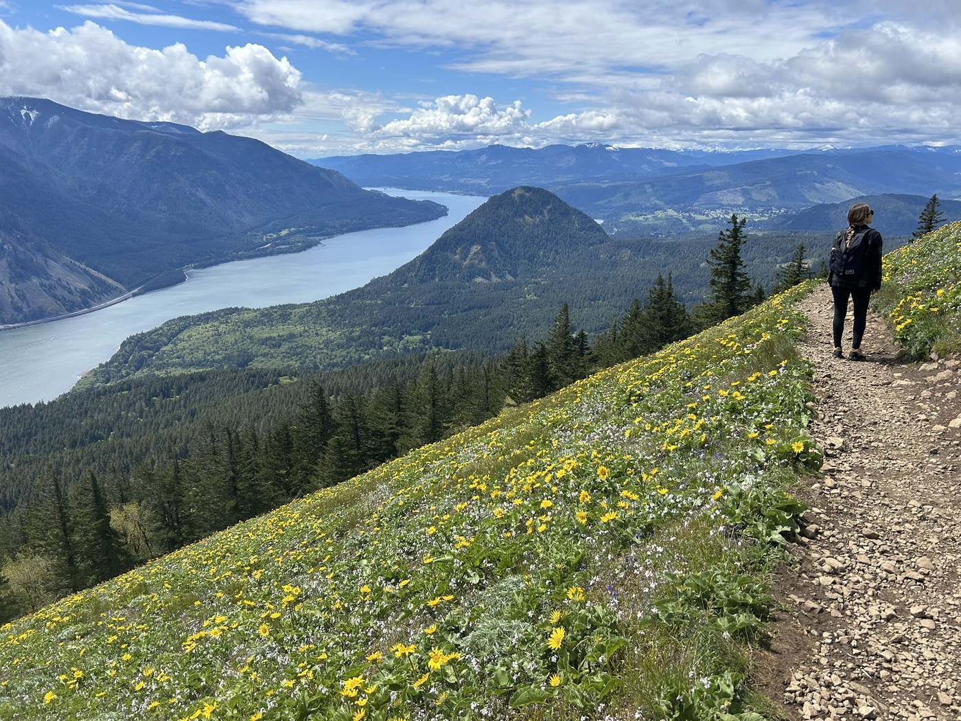 Arrived at TH at 10:30 Thursday morning. Large parking lot half full. No permit needed for weekdays. Used National Park pass for parking. Trail was intermittently muddy under the canopy but dry once out in the open. Yellow flowers everywhere. Views of the Columbia and mountains beyond were amazing. Not windy at all up at the top. Slipping and sliding on the descent so sticks were a must for me. My daughter did fine without any. Gaia 6.62 miles, 2813 ft ascent.