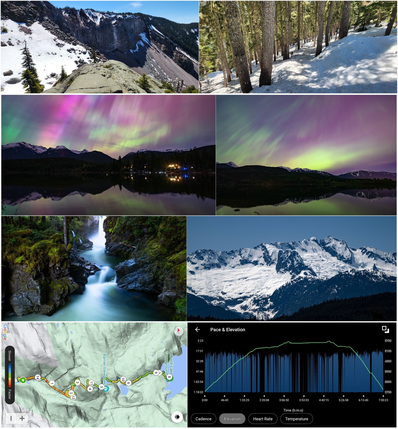 - Trail: The trail to the lake is ~6 miles, gaining 3300 ft. It never feels steep and is pretty mellow. This is like a US National Park trail - wide, well-graded and impeccably maintained. The ascent is through beautiful old growth. 2/3rd of the way to the top is "The Barrier" - a wall of rock that is holding in this massive alpine lake (up to 850 ft deep) that will one day fail with catastrophic consequences. There are warnings on Hwy 99 and the access road about the risk. From the (beautiful!) Barrier lookout, there was a lot of loud and dusty rockfall, and you would be forgiven for thinking you picked "the day"! Beyond the Barrier, you pass two smaller (frozen) lakes, and the trail becomes a little more hazardous with snow bridges and fractures that will eventually fall down the steep slope downhill from the trail. Eventually, you reach the lake basin, and it is otherworldly - a huge lake surrounded by peaks and glaciers (in many ways, more dramatic that Lake Louise in Banff). The "Battleship Islands" are simply mounds of snow in the lake right now. The dazzling emerald color of the lake is starting to show through in spots. There were numerous backpackers spending the night (although only one tent pad clear of snow) - I was envious as this would be an amazing spot for the aurora!! CAUTION: Black bears, thin ice, avalanche slopes and (an increasing number of) grizzly bears (although they seem to be mostly west of Whistler right now). Bear spray recommended. Right now, micro spikes are required. We left around the same time as a couple other parties that did not make it due to the snow (both had only running shoes!). My boots were soaked through by the time I returned, with a deep 18" layer of slushy snow around the lake where I did some trail breaking to get to the Battleship Islands. There are no dogs permitted on this trail. Other hikes reported that snow was too deep and soft to make it up to Taylor Meadows or Panorama Ridge.