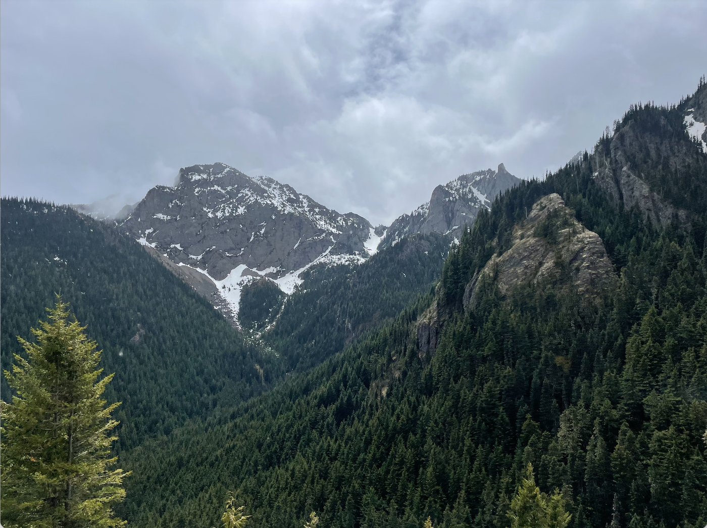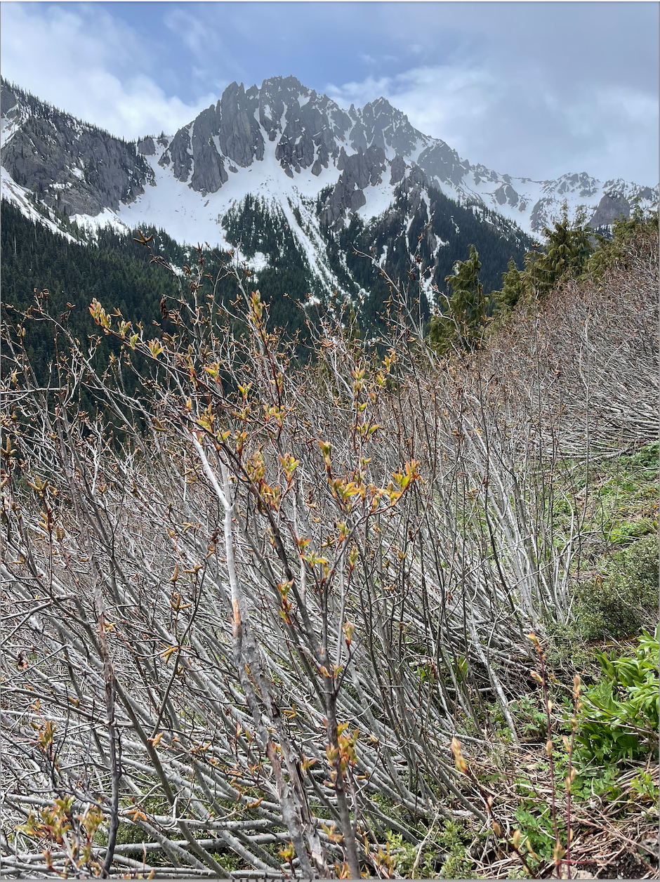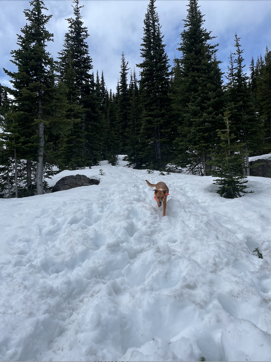 Started the hike up to Marmot Pass at 10:30am with a pretty full parking lot, but only saw a handful of people on the trail. The first part up to Camp Mystery is impeccably maintained and a joy to hike. Snow started somewhat consistently after that, but even microspikes might be overkill - though it is consistent, there is a boot path and it is pretty doable to cross in trail runners up to Marmot Pass. Our dog was not having as easy of a time on the snow as we were, so we ended up turning around just before the pass to give her post-holing tiny legs a break. From talking to other hikers, the route up Buckhorn is clear right now. We were so lucky to have nice, cool weather and wonderful views despite a cloudy day and will be back for Buckhorn soon!