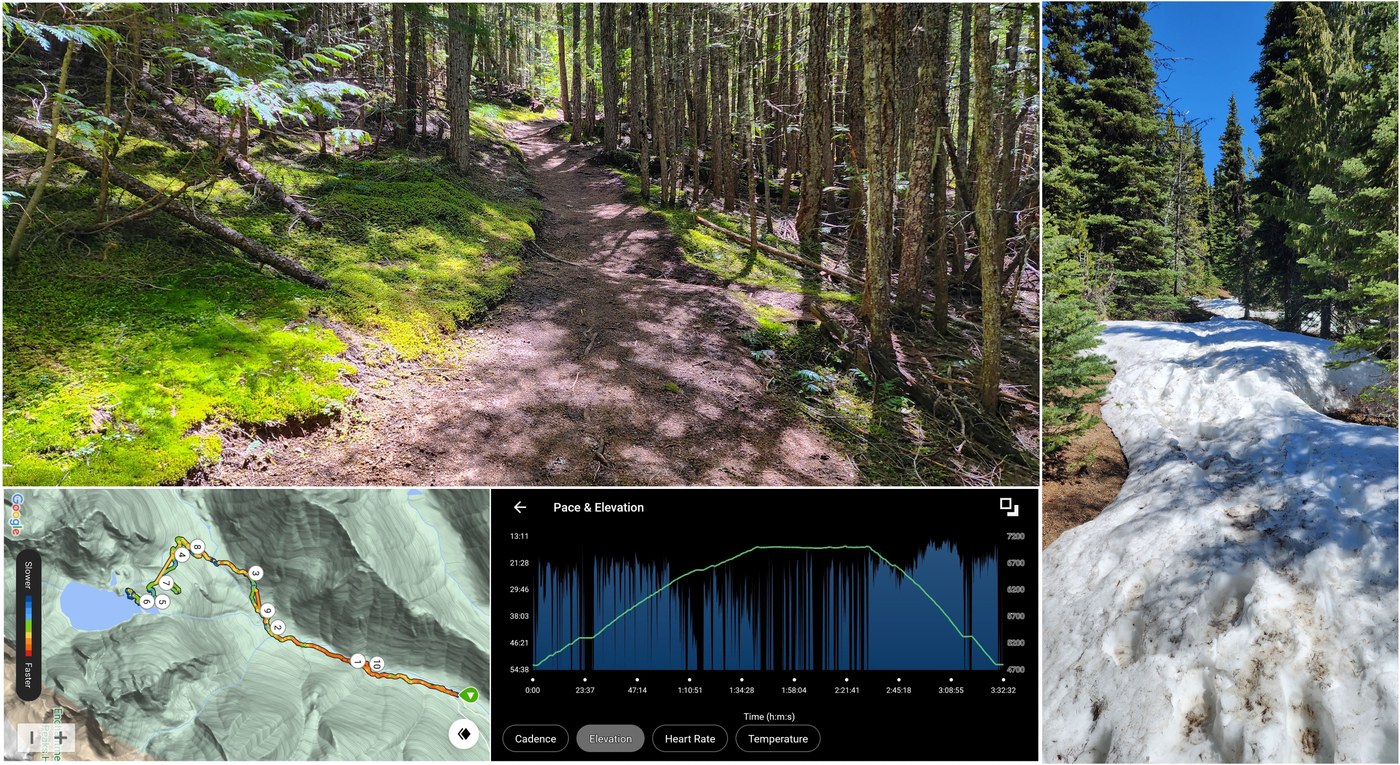 - Weather: Sunny, no wind, 60s to low 70s, BEAUTIFUL; quite warm at the lake with all the reflecting snow and exposure, making the snow ascending above the lake very soft (kind of like hiking uphill in sand)