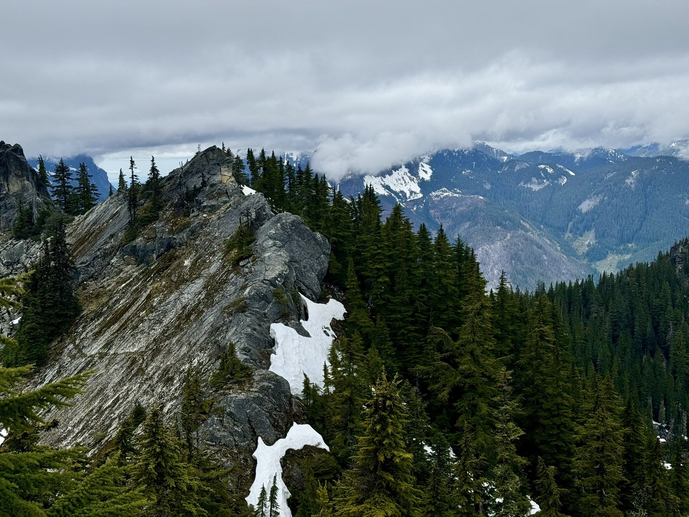 Trail run was slowed by one small tree to hop over in the first 1 KM, the snow fields began around 4200 feet, becoming larger at 4800 feet all way to the summit. Summit partially covered. Road up and down is navigable, some potholes are deep.