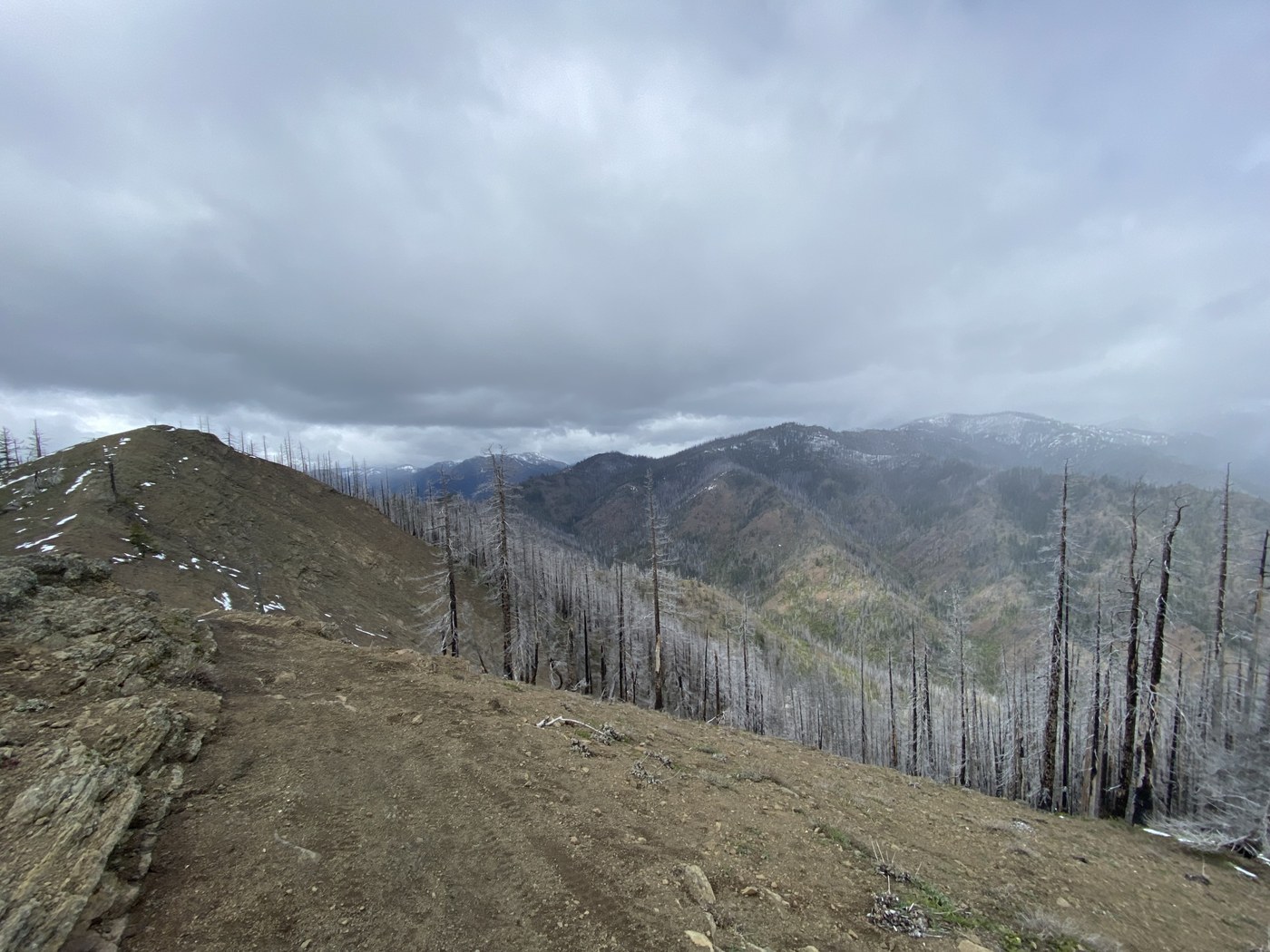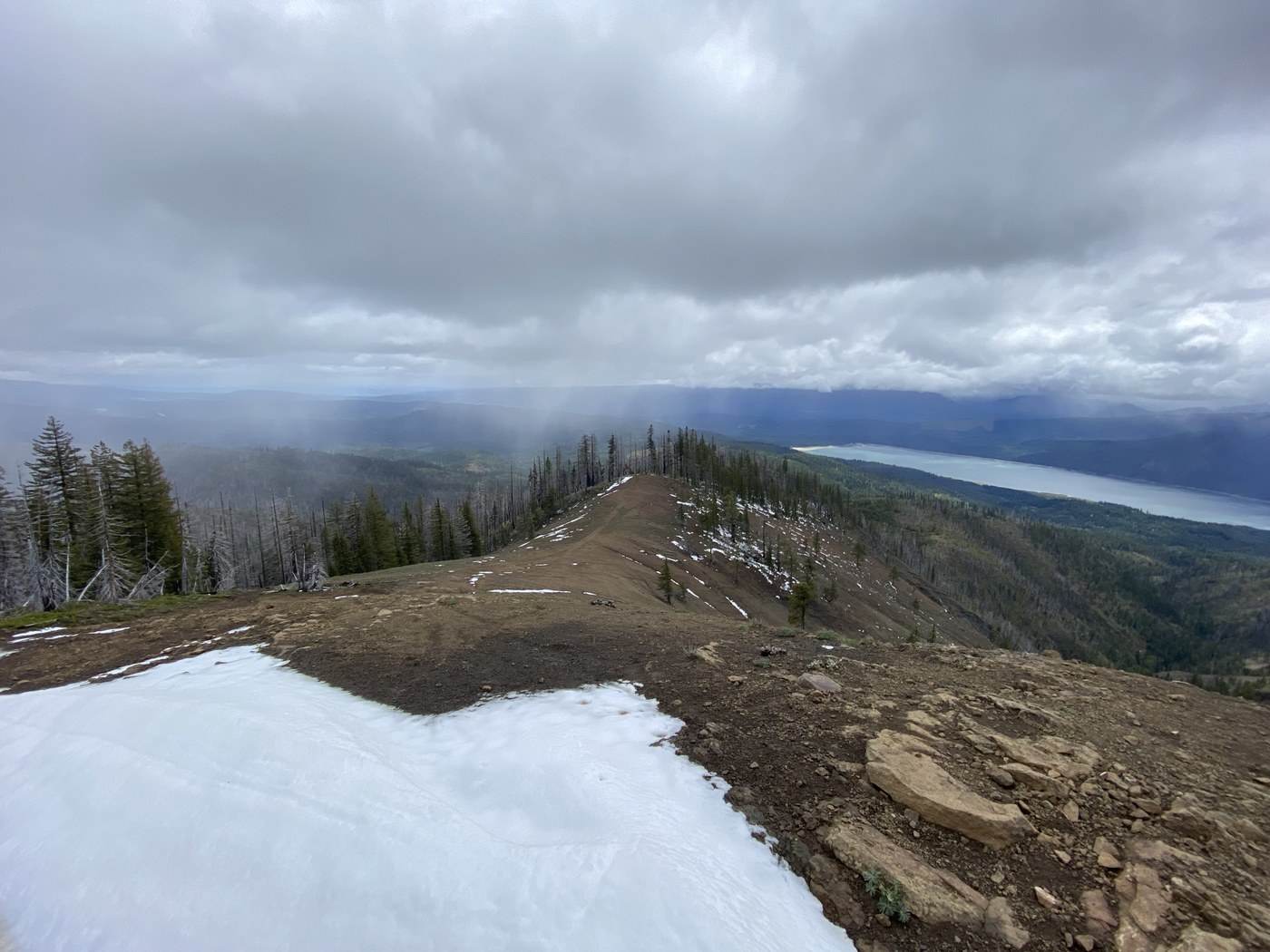 I hiked this trail on Wednesday, May 22. There is not a parking lot at the trailhead, and the private road entrance is blocked with a gate an a "no parking" sign. So, we parked on the main road. Aside from my friend and me, there was not another person on the trail the entire time we were hiking. The trail is a combination of dirt roads and trails. I really recommend downloading a trail map for navigation, because it's easy to miss the trail when going back and forth from dirt road to trail. There were quite a few downed trees to hike around/over, and there was intermittent snow towards the top, but not difficult to cross. The weather was overcast and windy, with a few sun breaks, so our view at the top was not as great as it could have been. Still great exercise and was fun to have some snow flurries at the top.