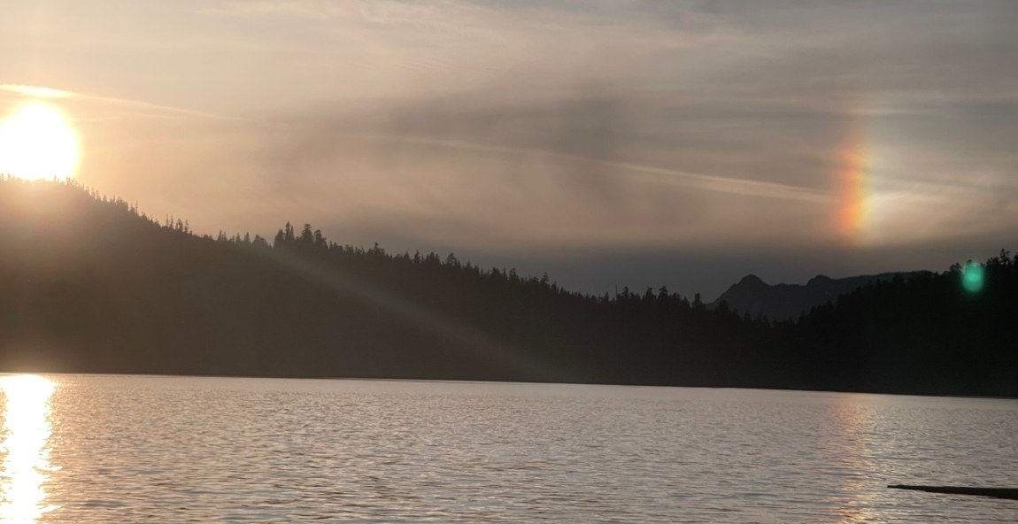 Backpacking up at the lake went well. The trail is great though there's a bit of horse manure so watch where you step. We got up a little late on Friday and there were at least 10-15 groups of backpackers ahead of us, but we managed to find a good site. Bugs were not bad if you plan on day-hiking, but if you are setting up for camping there are mosquitos out -- only a slight annoyance at most. Some fish jumping at the lake - even caught one fishing for a brief moment but slipped off at shore. The lake water is not ice-cold, but is still extremely cold, not enjoyable yet except for the boldest swimmers. Had a great warm sunny evening, and even saw some sort of beautiful cloud-bow effect as the impending weather moved in. On the last abbreviated day of our trip we went further up the valley but hit a large gushing creek about a mile past the end of the lake. The main trail here is somewhat impassable save for those willing to take a little risk and get quite the soaking.