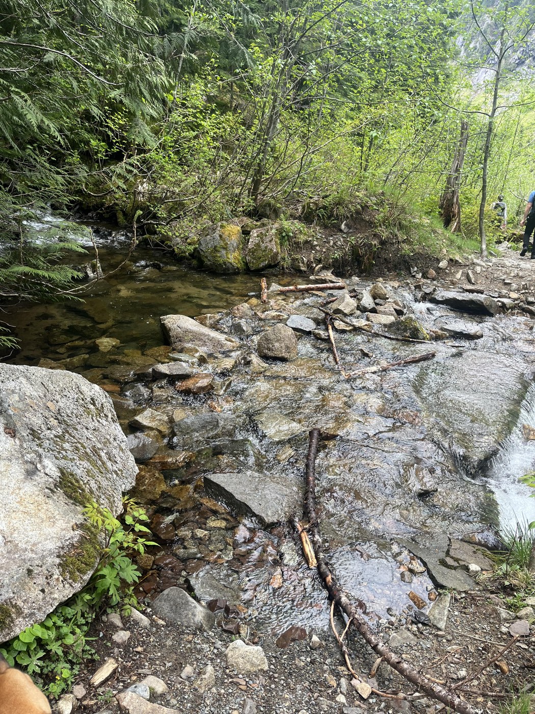 Trail is in great shape! No snow. The muddy sections had dried out a bit by June 1 and were not a problem to cross, but that may change with the rain the next few days. Most water crossings were not too bad - there were rocks you could use to get across. There was just one water crossing after the juncture with Thompson Lakes that was a little bit bigger (see photo). Still possible to cross by rock hopping, but your flippers might get a little wet. Water crossing conditions might change with all the rain and higher temps.