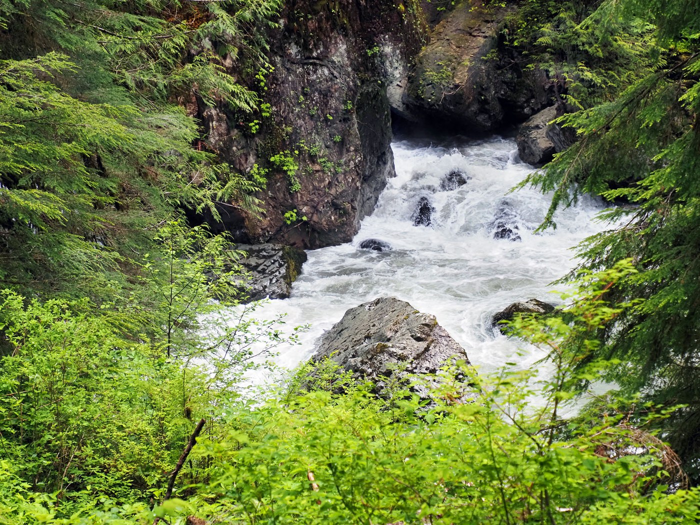 It was a good time to see all the waterworks as the river is at near full volume as are the falls along the trail. The trail was a waterwork as well. There were streams across the trail I had never seen before. In general the trail is in good condition-seasonal mud in places and the water that could mostly be avoided. I went as far as Meditation Falls and had lunch there overlooking the river and the fall on the opposite side. Along with the usual noise of the water movement it also made a strange hissing sound.
