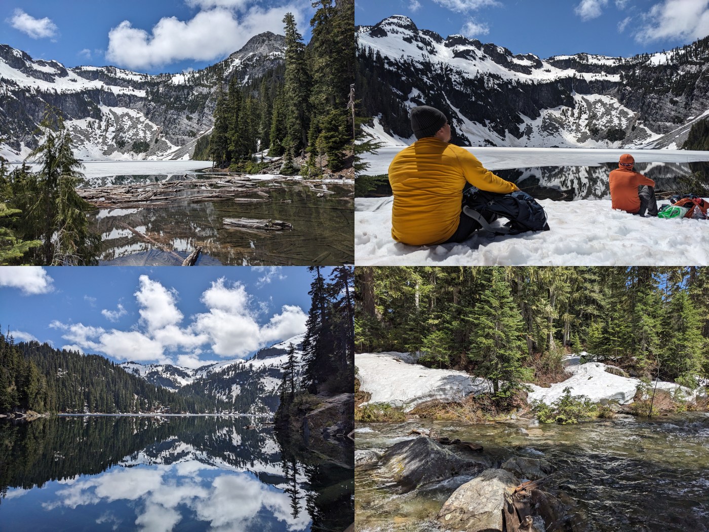 COPPER LAKE: Copper Lake is 100% melted out. The views are gorgeous right now with most surrounding peaks still covered in snow. Some of the forest around is melted out, but much of the surrounding terrain is still covered in several feet of snow. The large campsite on the west side of the lake is melted out. From this site, you can hear the roar of waterfalls on the southwest side of the lake.. We couldn’t get to the east side where the trail continues, but it looked more snowy. There is some snow on the trail between the Malachite Junction and the Copper Lake outlet, but it’s all pretty flat and easy. I went about halfway across the logjam for some views, but getting all the way across the logjam didn’t look doable now, since too many of the logs are floating.