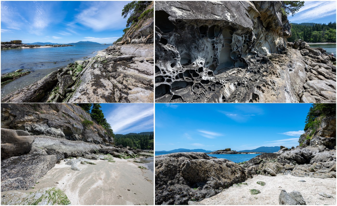 - Trail: Beautiful forest trails in the woods above the beach, and exceptionally low tide for beachcombing, and exploring the unique rock formations (see pics). The pocket white-sand beaches from the crushed oyster shells do not look like they belong in the PNW! Prolific buttercups and daisies blooming on the grassy areas up near the entrance. Nice to see purple and orange starfish coming back after the wasting die-off!