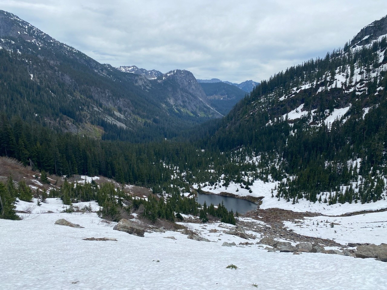 Plan was a quick hike up to the saddle with a loop along the ridgeline and down to source lake, then back to the trailhead. Lots of people were out on the snow lake trail today. There were a few patches of snow along the way up, with more consistent snow starting just before reaching the saddle. Looks like a lot of snow still on the snow lake side of the trail, though I didn’t do the descent to the lake. I enjoyed the views of the lake for a bit and then continued along the ridge which was all snow covered. The descent toward source lake was tricky as I got close to the source lake trail due to post holing. There were great views of Chair Peak and The Tooth, and I could see two groups heading up the snowfield to Pineapple Pass. Following the source lake trail, there was still snow to cross, with thin snow bridges and postholing being an issue. I made it back to the main trail and continued to the trailhead as planned.