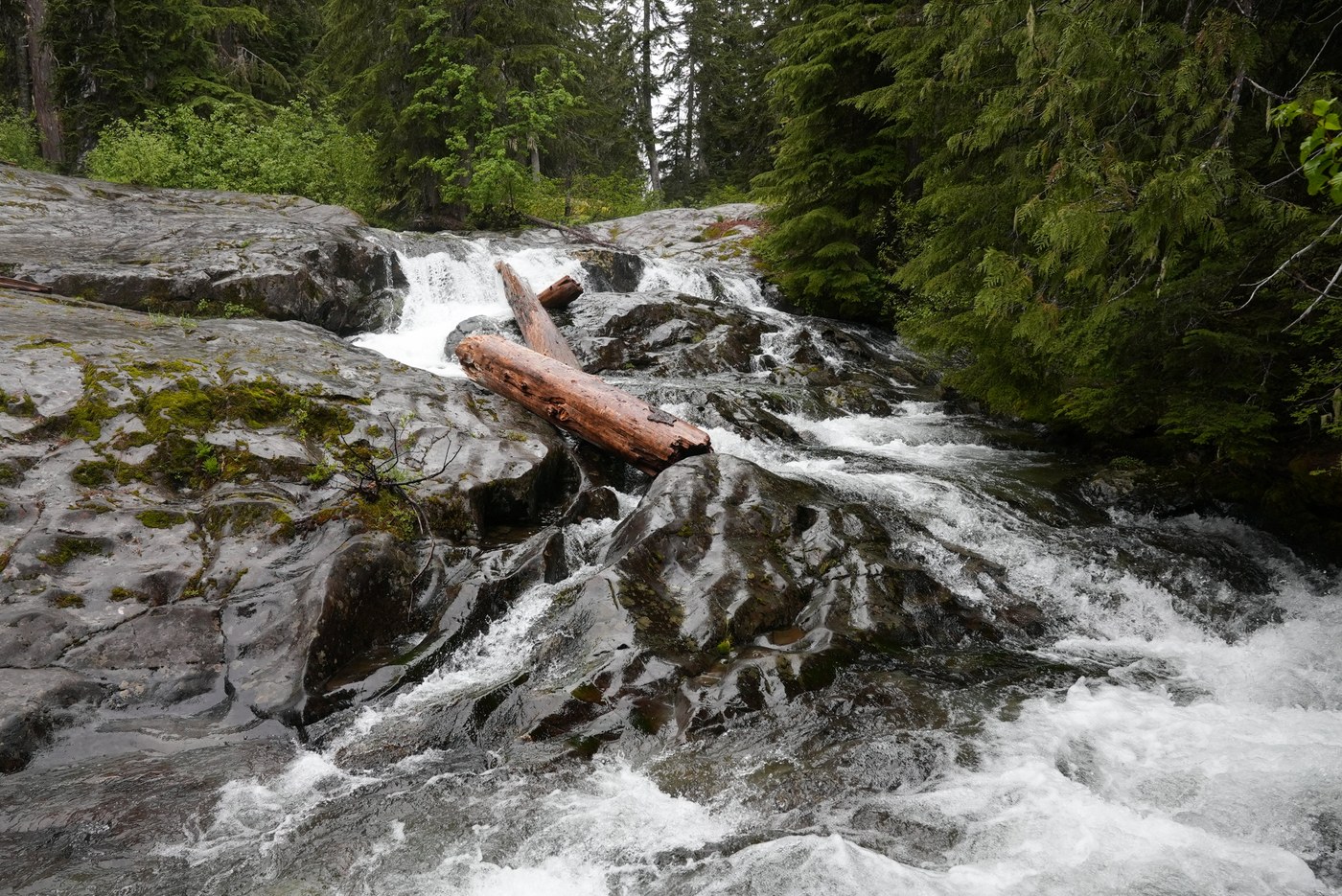 The weather was a bit temperamental on Saturday. We'd go through patches of brilliant sunshine with visibility to neighboring mountain peaks, and then hit pretty sudden rain, followed by snow. Temps were cold above the waterfall four miles in. The trail does peter out a bit there, and we didn't risk making it to the lake. However, the hike was very interactive with all of the waterfalls and skipping over rocks and navigating creek crossings. For the whole time, we passed around five groups.