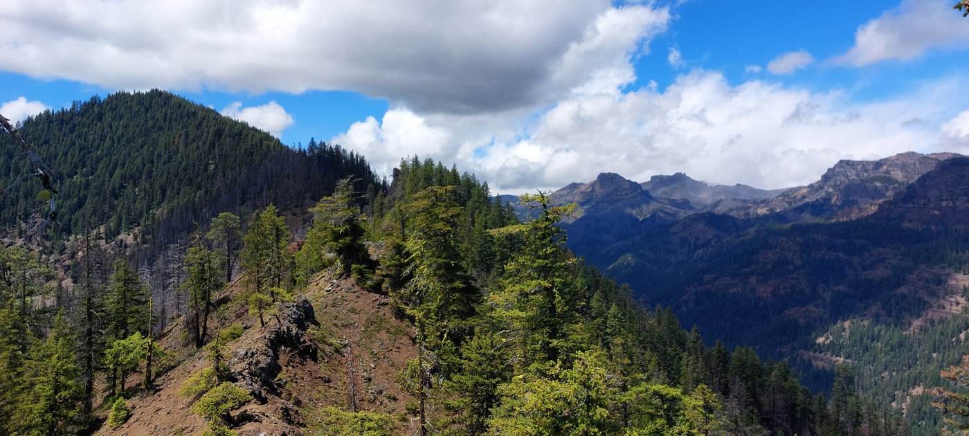 The first mile or so is in good condition. It gets more use due to the nearby campgrounds and Chinook Pass Outfitters uses it for horse rides. The dust is a bit deep on the first section due to that, but otherwise in perfect condition. There are several viewpoints early on, looking down at the American Ridge Ski Bowl and Lodge. Trees have covered most of the ski slopes now, but it amazing to think about the hardy folks that skied these steep slopes on 1930-1950s ski technology! Soon after the viewpoint down towards the lodge, an open sunny viewpoint looks south, and provides a good rest stop with boulders to perch on. Several groups from my family trekked up to this point from the lodge, to take in the views. Around 1.5 miles from the trailhead, you will come across another open view point, complete with a fire pit and flat spots for tents if you were looking for a short overnight trip, or just a good picnic spot. Past this point, the trail starts to deteriorate due to the regrowth from the 2021 Schneider Springs fire and lack of use. There are trees down, but they are not difficult to navigate, however vegetation is rapidly taking over the trail tread. It may be challenging to hike within the next few years. We cleared branches and debris as we went, only losing the trail briefly when it steeply switchedbacked up the nose of the ridge. We turned around at a fantastic viewpoint around 2.3 miles in. On an open slope along the ridgeline, you will see a burnt American Ridge sign on a tree, and a short spur trail to a small open knoll, which looks NW to Fifes Ridge, SW to Old Scab Mountain and Nelson Ridge, and south down to the Bumping River. While sections are burned, it is still a lovely trail with a mix of firs, pines, and larches in areas. As with any burned zone, stay alert or avoid on windy days, as dead trees are still coming down. Some of the towering Ponderosas survived the blaze, bearing new fire scars along their trunks. Balsamroot, lupine, bitterroot, penstemon, scarlet gilia, phacelia, buckwheat, silvercrown, paintbrush, and desert parsley were in bloom at various points along the trail. It was an interesting blend of forest and shrub steppe species mixed together on this hike, with the shrub steppe species dominating the hot south facing slope at our turn around point.