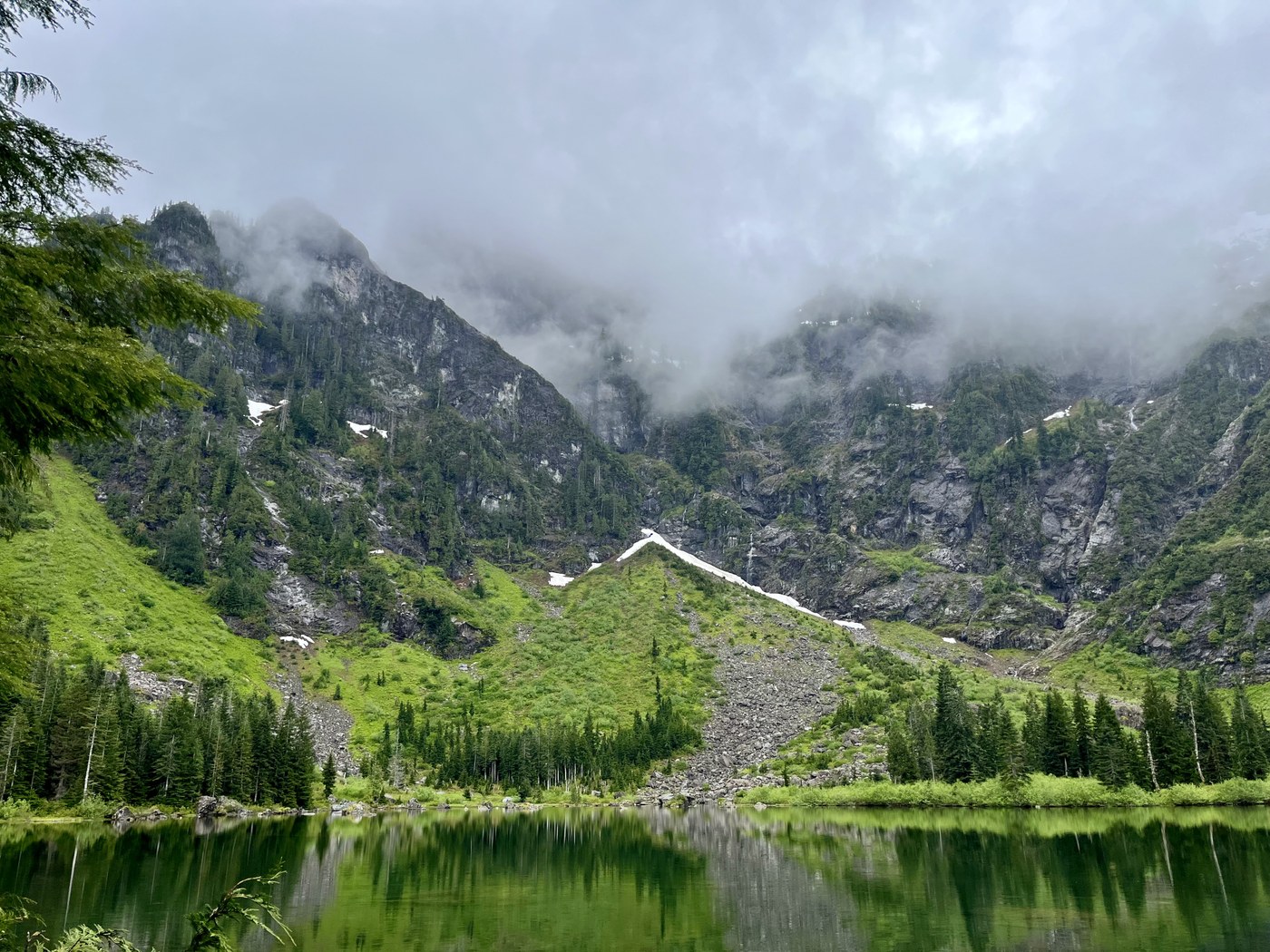 There was no snow on the trail, we were able to follow the entire trail that circumnavigates the lake, definitely recommend adding the extra 1/2 mile or so. There was no concern for avalanches coming off Pilchuck either, which is a concern sometimes in early spring.
