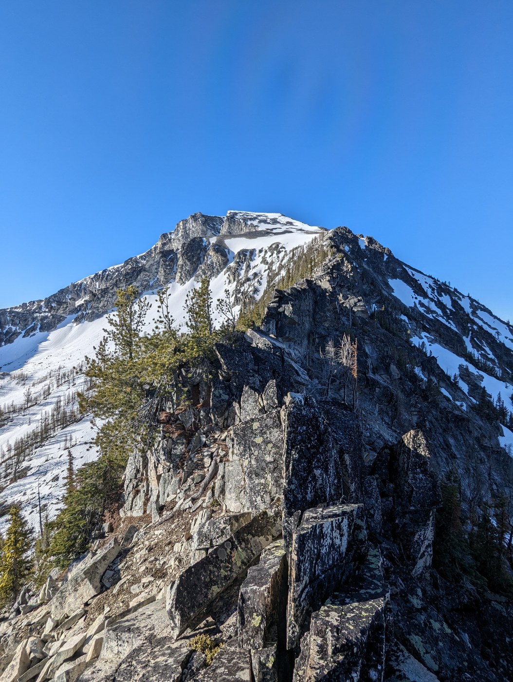 The snow was very compact and with our current abnormally cold weather conditions for this trip, it refroze higher up. My wife put on crampons, and I kept my trail runners on. As long as one sticks to the rocky W side of the N ridge going up, tennis shoes are fine (YMMV).