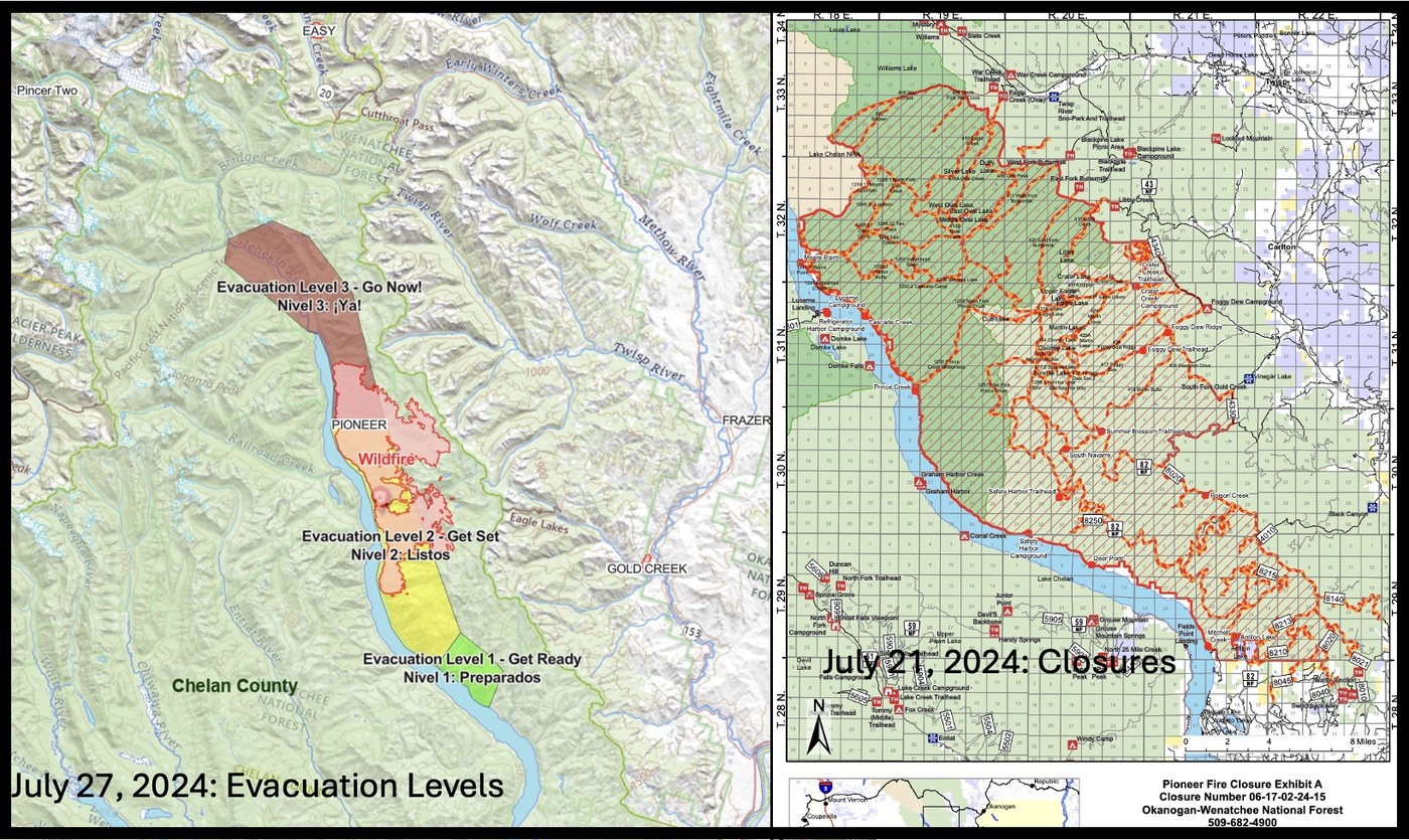 Status for July 8,2024: Pioneer Fire has grown rapidly to 9,055 acres (Figure 1), smoke has greatly increased, and Figure Evaluation and Closures areas have increased. USFS Roads 82, 8020, 8215, 8250 are closed; trails 1248.1, 1250.1, 1254, 1255, 1257, 1258, 1259, 1260, 1261, others (check local Ranger District). USFS trail names do not always correspond with WTA's and many of the minor USFS trails are not found on WTA. Air Quality State wide has become poorer as a result of the heat dome and the fires.