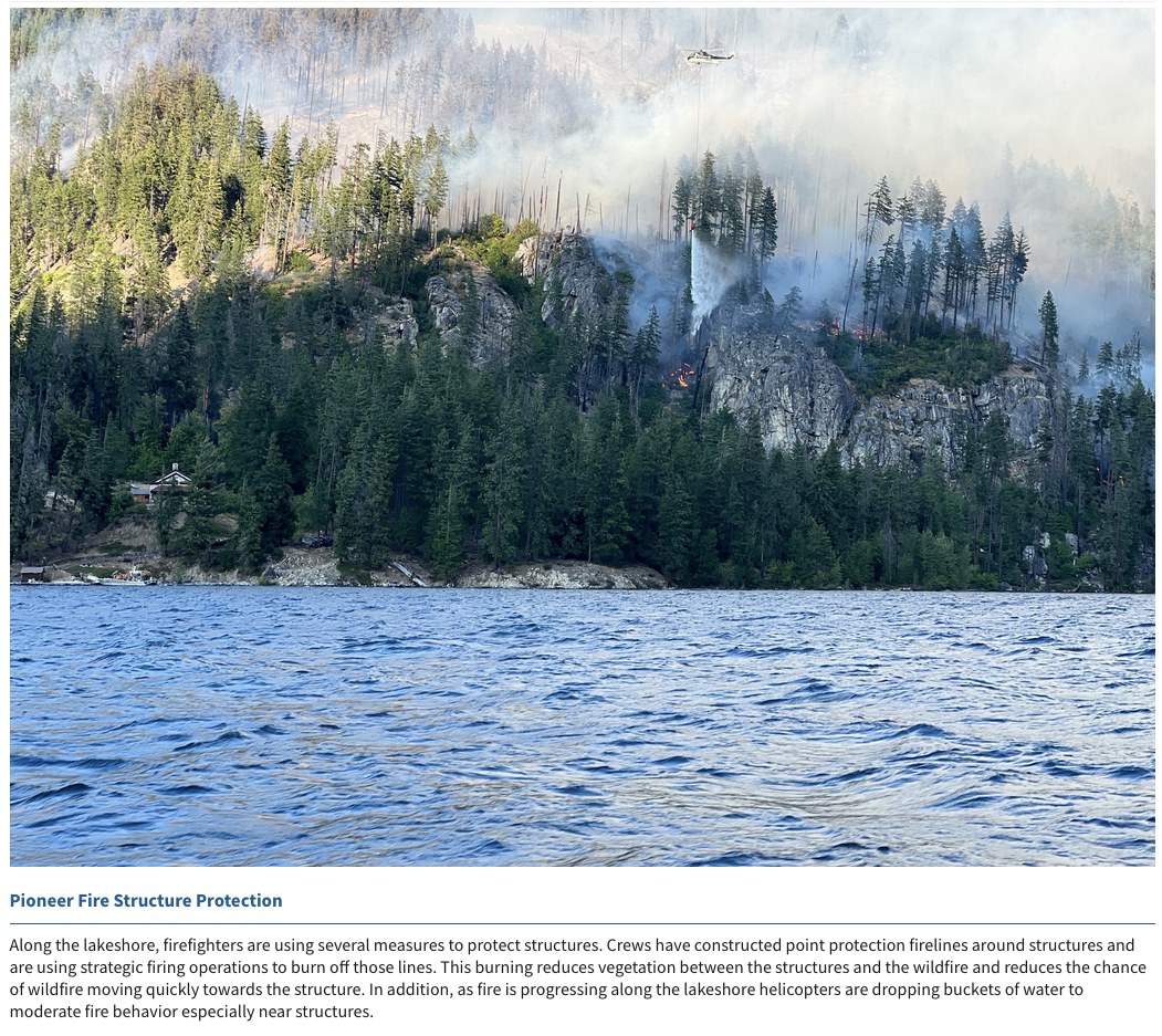 Update Status for August 1: The cooler temperatures and cloudy weather enable fire fighters to work on and with the Stehekin community to make their structures and property more fire resistant (see Figure 3) for an illustration of the spot work occurring. The next eight day plus stretch of hot, dry weather will be critical. The fire is active and continues to expand. The effort by both fire fighters and community members is amazing -- I do not think any of us can imagine how hard this is for all concerned. In many ways, the stress and effort will only abate when it begins to snow.