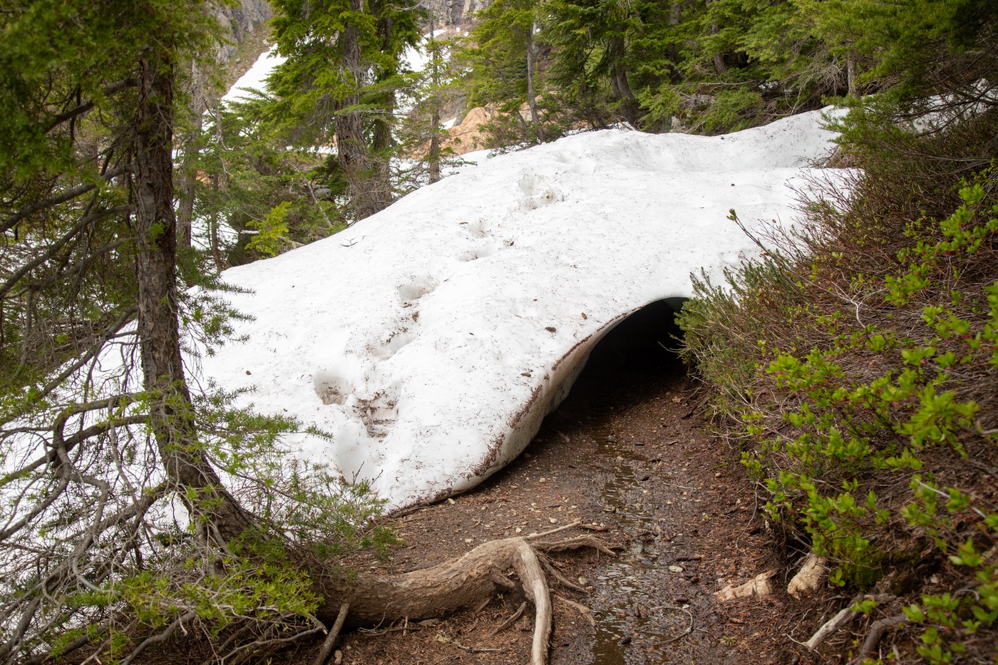 There is a stretch of snow-free trail on the south-facing traverse, but that is short-lived, so you'll be on snow nearly all the way. The route is more direct. Expect to post-hole, and be increasingly aware as the snow bridges melt out and expose more hazards. Grippy footwear, gaiters, and microspikes helped make way across the very soft, wet snow. Definitely expect to post-hole. Most of the larger stream crossings up above 5,000ft were still snow-covered, though signs are showing they'll punch through soon, so be careful.